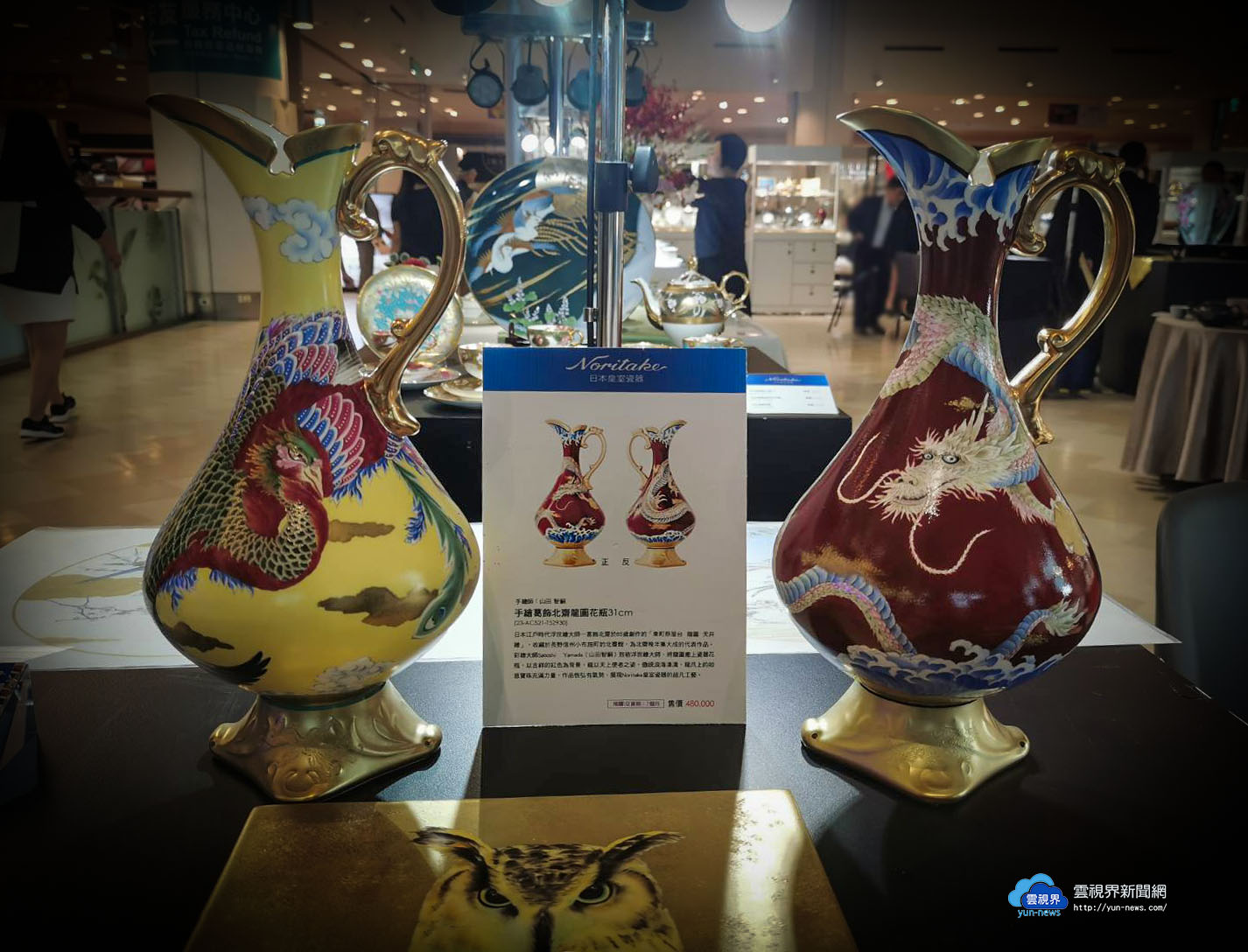 ▲(左)手繪葛飾北齋鳳凰圖花瓶31CM(右)手繪葛飾北齋龍圖花瓶31CM於現場展示。圖/雲視界記者魏雲日攝影