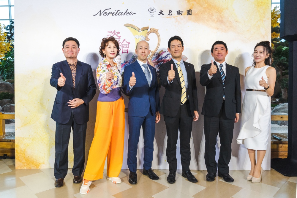 ▲(左一)旺代執行長王獻德, (左二)周丹薇, (左三)手繪大師山田智嗣, (右三)NORITAKE海外營銷部副總經理Suzuki(鈴木先生),(右二)NORITAKE業務經理Shiba Hiroyuki (芝 宏行),(右一)主持人小魚(圖/旺代企業提供)