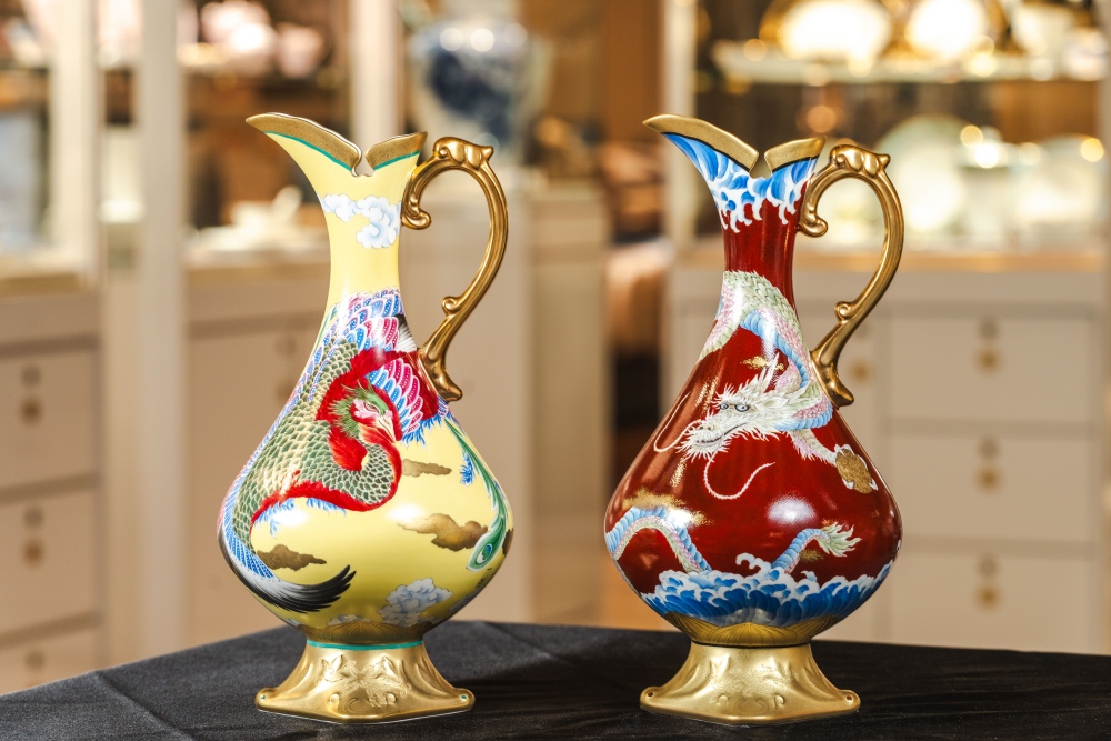 ▲(左)手繪葛飾北齋鳳凰圖花瓶31CM(右)手繪葛飾北齋龍圖花瓶31CM於現場展示。(圖/旺代企業提供)