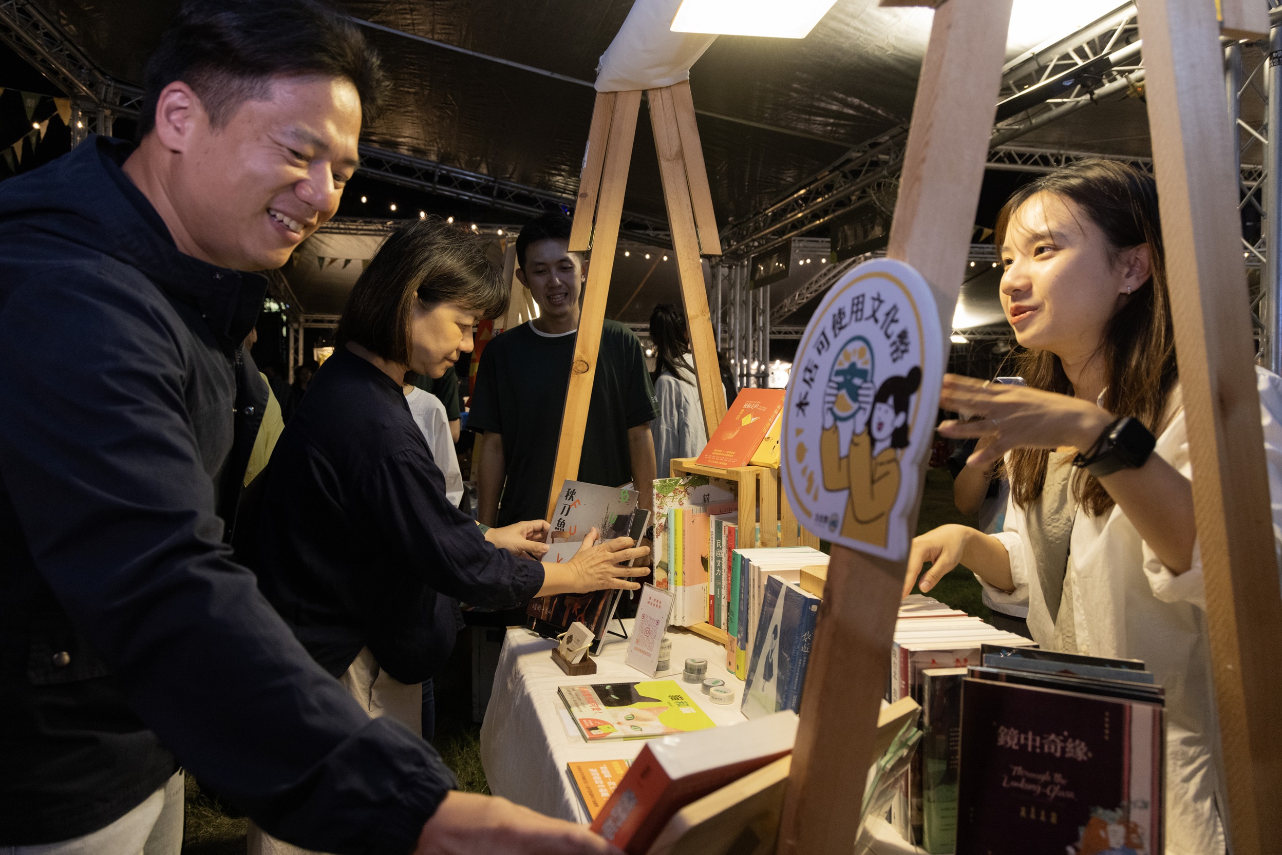 新竹場庄頭市集結合書市攤位,文化部政務次長李靜慧(左2)、新竹市代理市長邱臣遠(左1)翻閱「想,做書店」聚焦在性別人權、公民社會、土地環境等議題的選書 圖/文化部提供