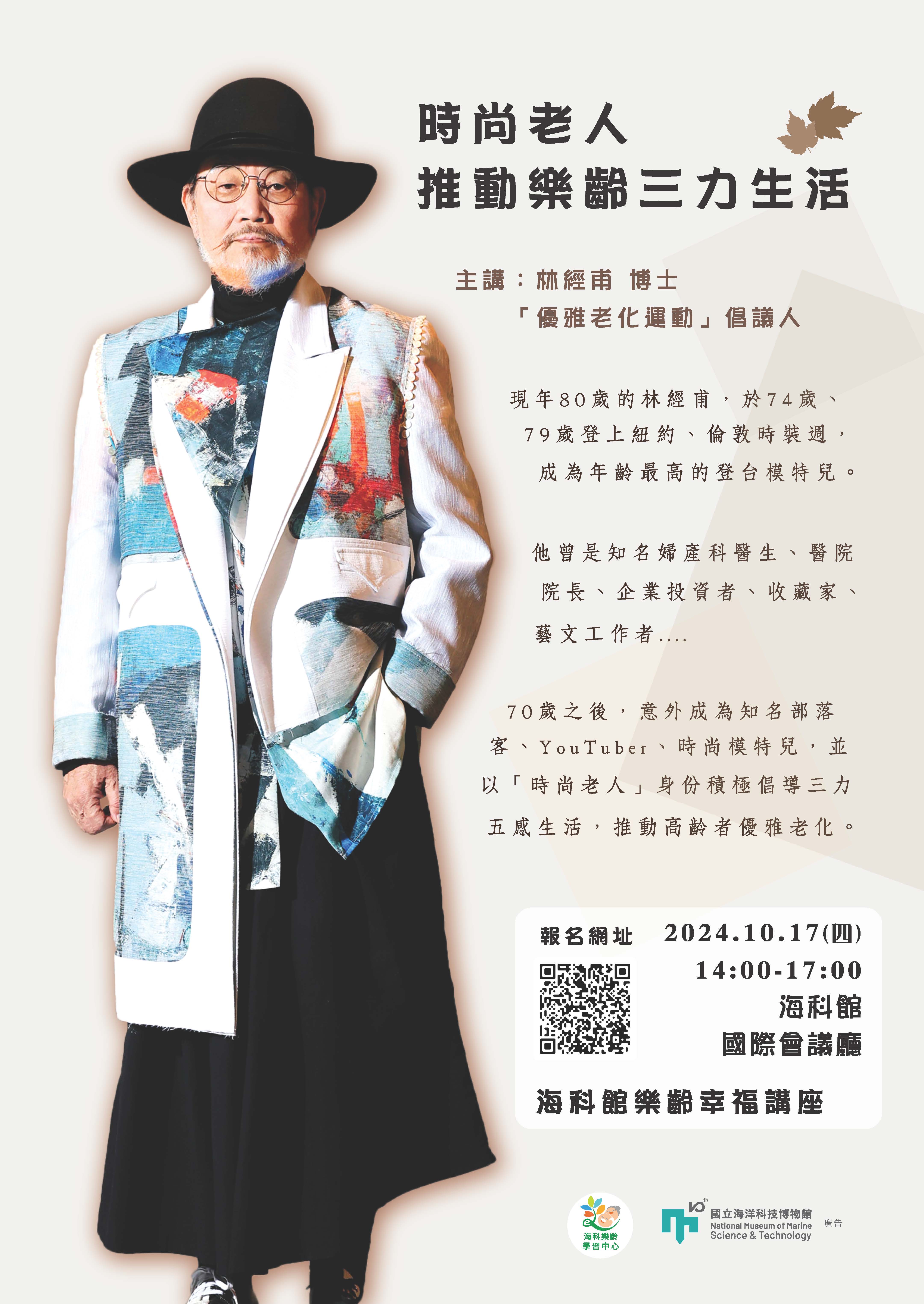 海科館樂齡學習中心繼一系列課程之開辦,於10月份特別規劃有2場與健康和生活安全相關的講座,並採以不限年齡提供給有興趣的民眾參加,首場講座將於本週10月17日(四)下午2點登場,特別邀請這幾年享譽國內外時尚圈與文化界的知名人士「時尚老人」林經甫博士到海科館分享「力行三力 享受五感生活」,帶領大家如何優雅老化與健康生活。另一場講座則針對生活中到處存在著詐騙手法,海科館也特於10月24日(四)下午邀請具有實際偵察與經辦詐騙案件的專家進行一場「麥擱騙啦!如何預防詐騙」的課程講座,讓大家認識生活中一些詐騙手法,避免身家財產被有心人士詐騙,而身陷不法或財產被掏空。