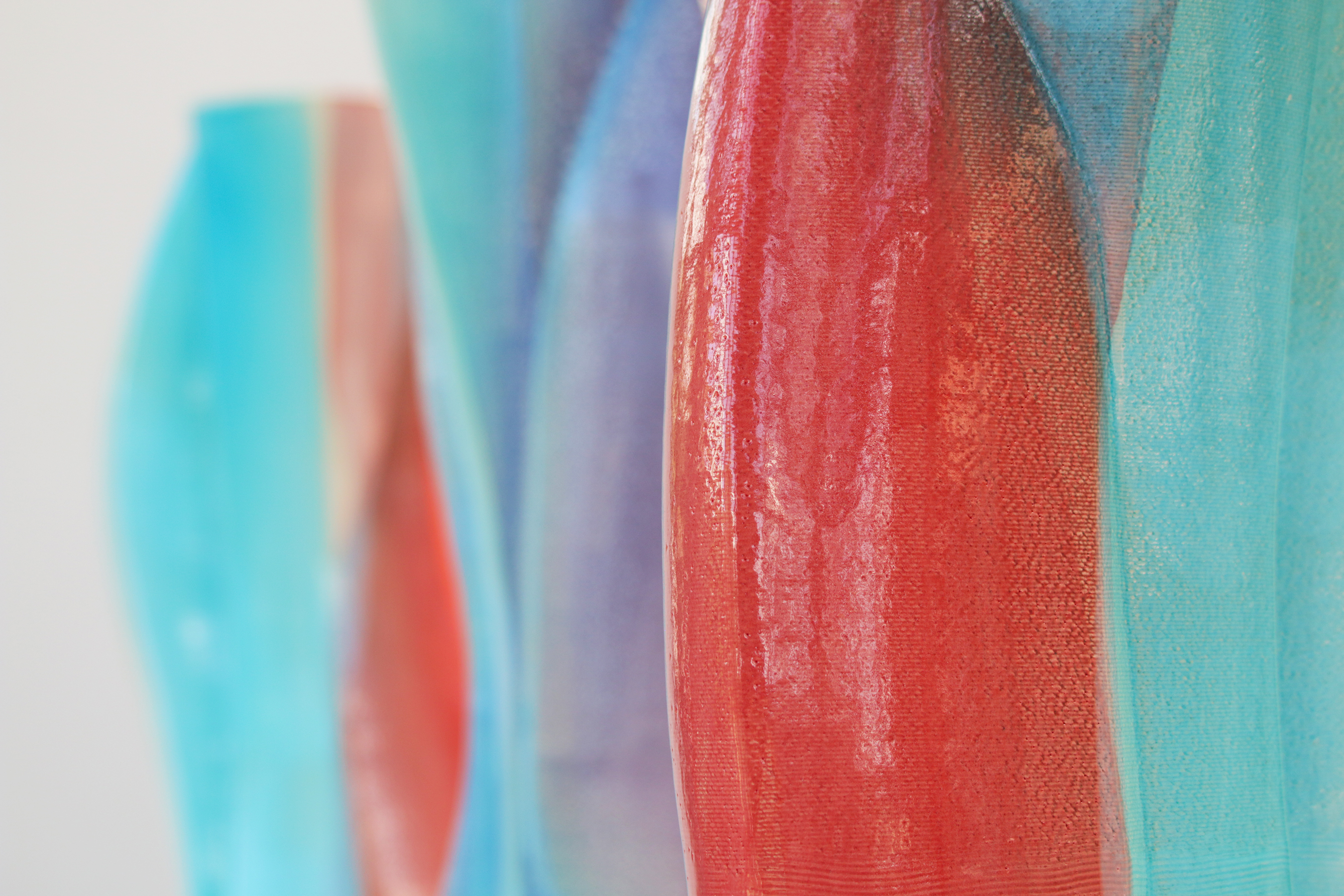 大衛莫里斯的陶藝創作受二十世紀末解構主義建築的啟發,以多室、多面和彎曲的結構相交,創造出動態感,遠看仿如舞者躍動曼妙舞姿般令人賞心悅目。釉彩技術則向十二世紀波斯的精美陶瓷和埃及彩陶之美致敬,再現迷人綠松石色調,與古老的藍綠色調與大膽的薰衣草色和珊瑚色並置,呈現色彩碰撞的意趣。