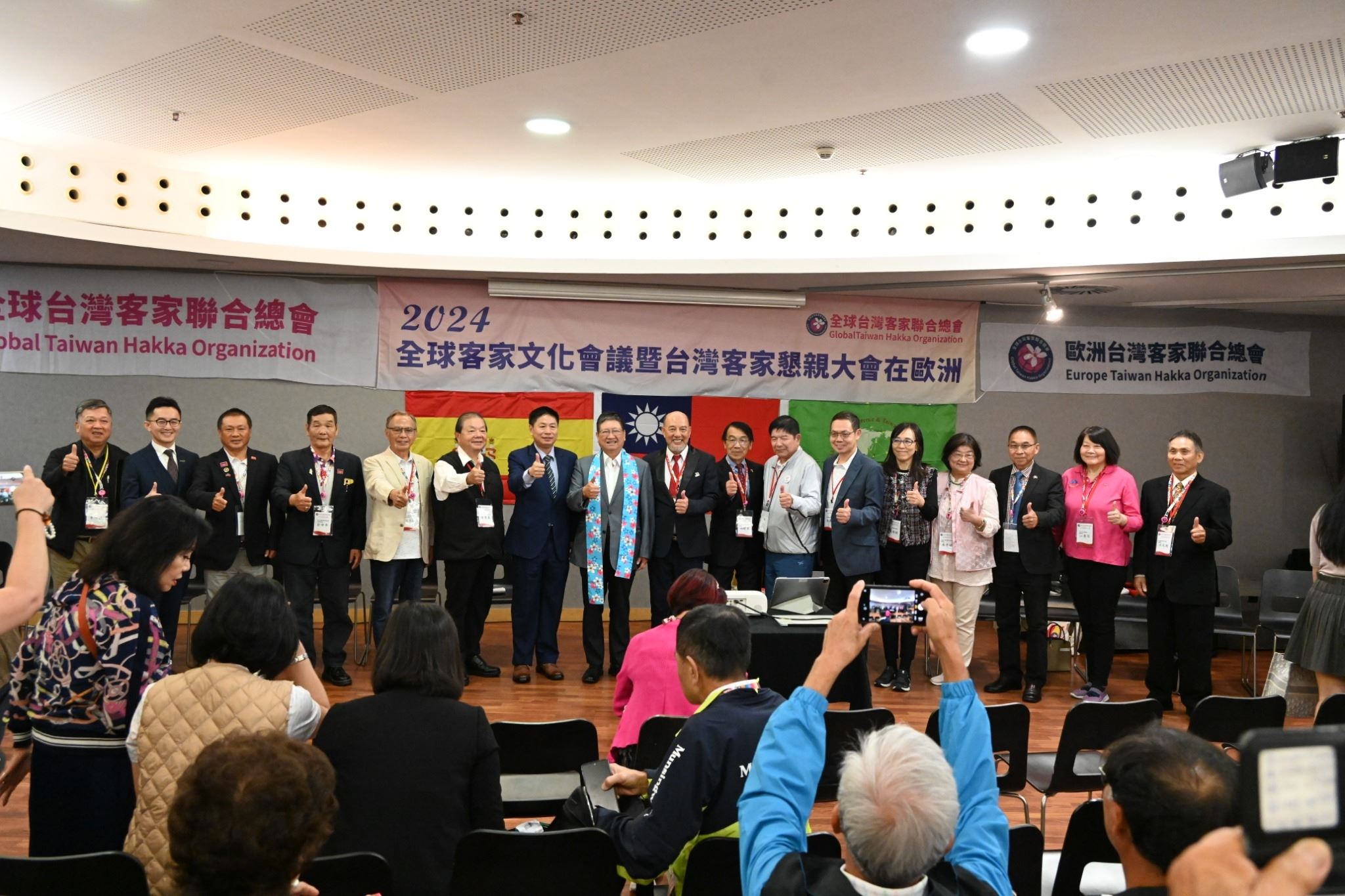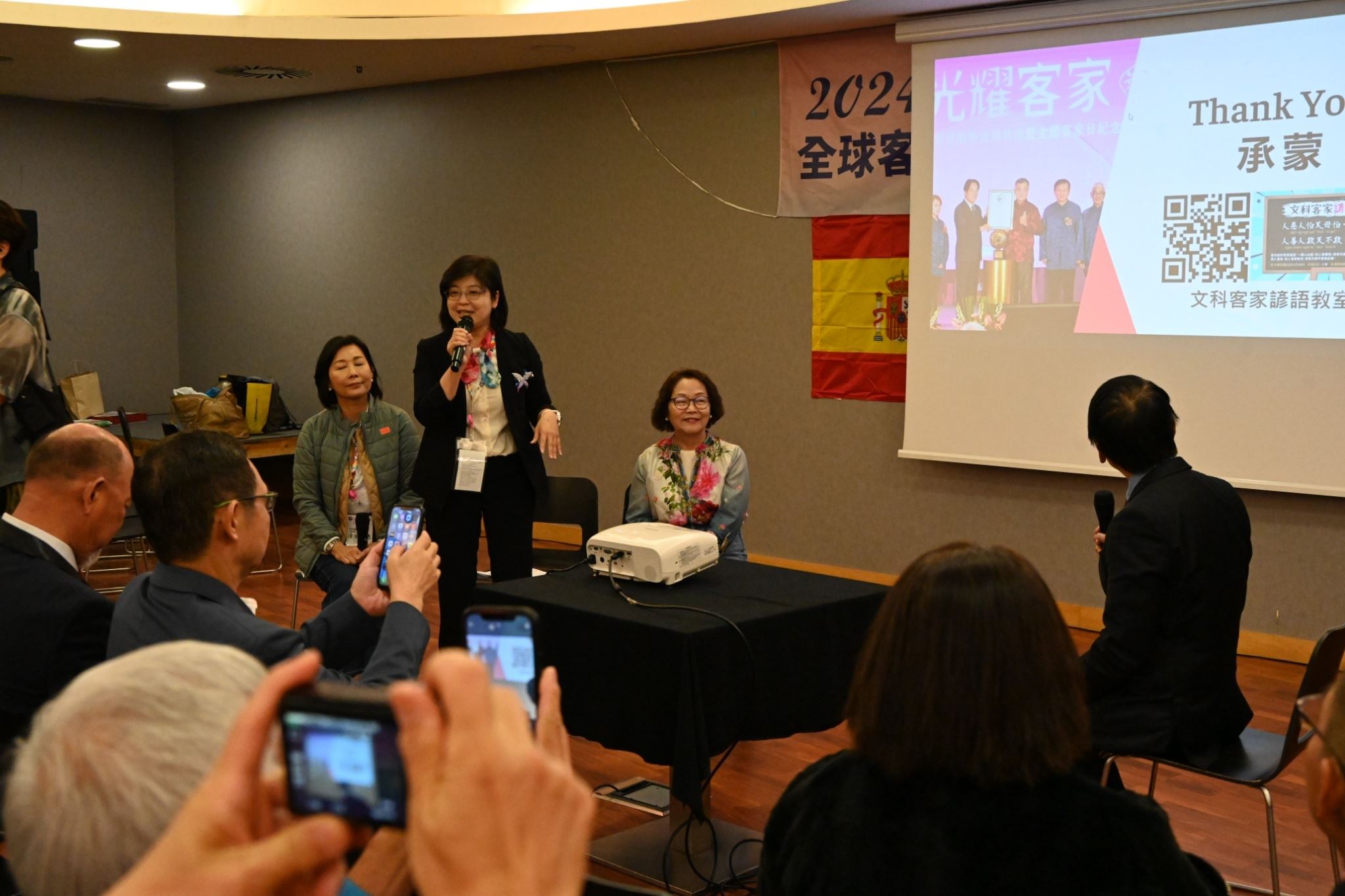 新竹縣長楊文科15日(西班牙時間上午9時)以台灣客家代表身分率團參加西班牙2024全球客家文化會議暨懇親大會,與來自全球六大洲的客家族群代表齊聚一堂,楊文科分享新竹縣推動客家語言與文化的豐碩成果,獲與會各界高度肯定,同時將4年來親身投入客語教學的文科諺語教室400集影片,藉此全球會議傳遞給六大洲代表,期盼透過眾人力量,把客語帶進六大洲的不同國家、社區,讓海外華人的年輕一代,更了解客語和其背後的文化意涵!