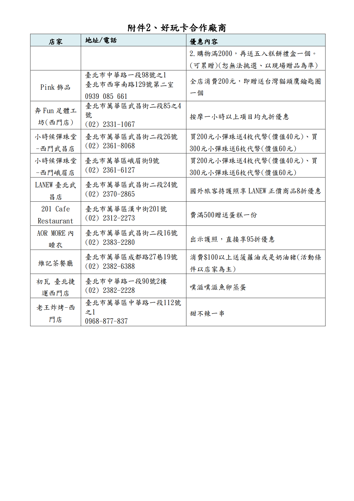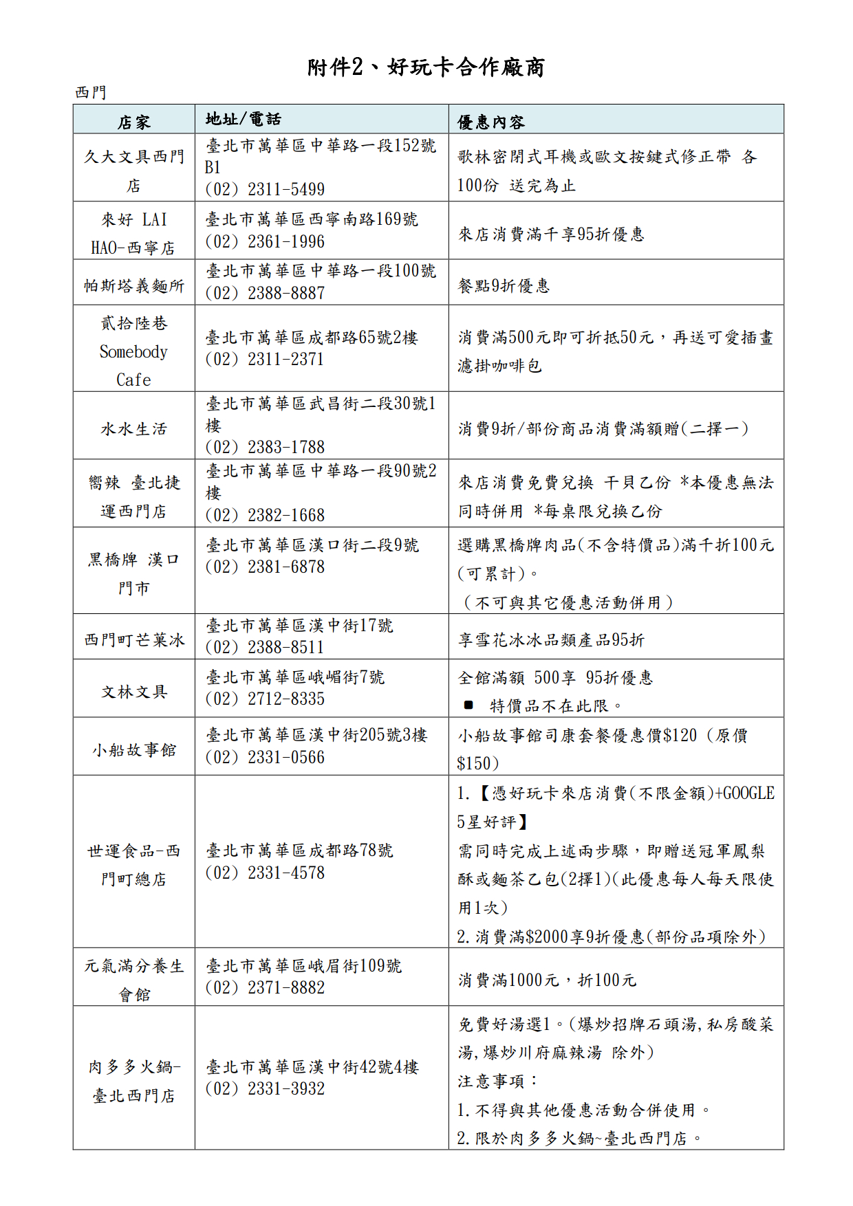 此外,世壯運應援一卡搞定,2025雙北世界壯年運動會特別推出限量3000張的「2025世壯運好玩卡」,出示好玩卡就能享大稻埕、永康、貓空與西門四大商圈,超過80家合作店家的優惠內容,更結合世壯運場館所在縣市及周邊共20個熱門景點門票與特色體驗活動選項,持卡可任選3個景點或體驗,再加上本身更具備悠遊卡的功能,交通、景點優惠一卡就能暢遊北臺灣!(店家名單及優惠內容https://reurl.cc/nvdYKl)