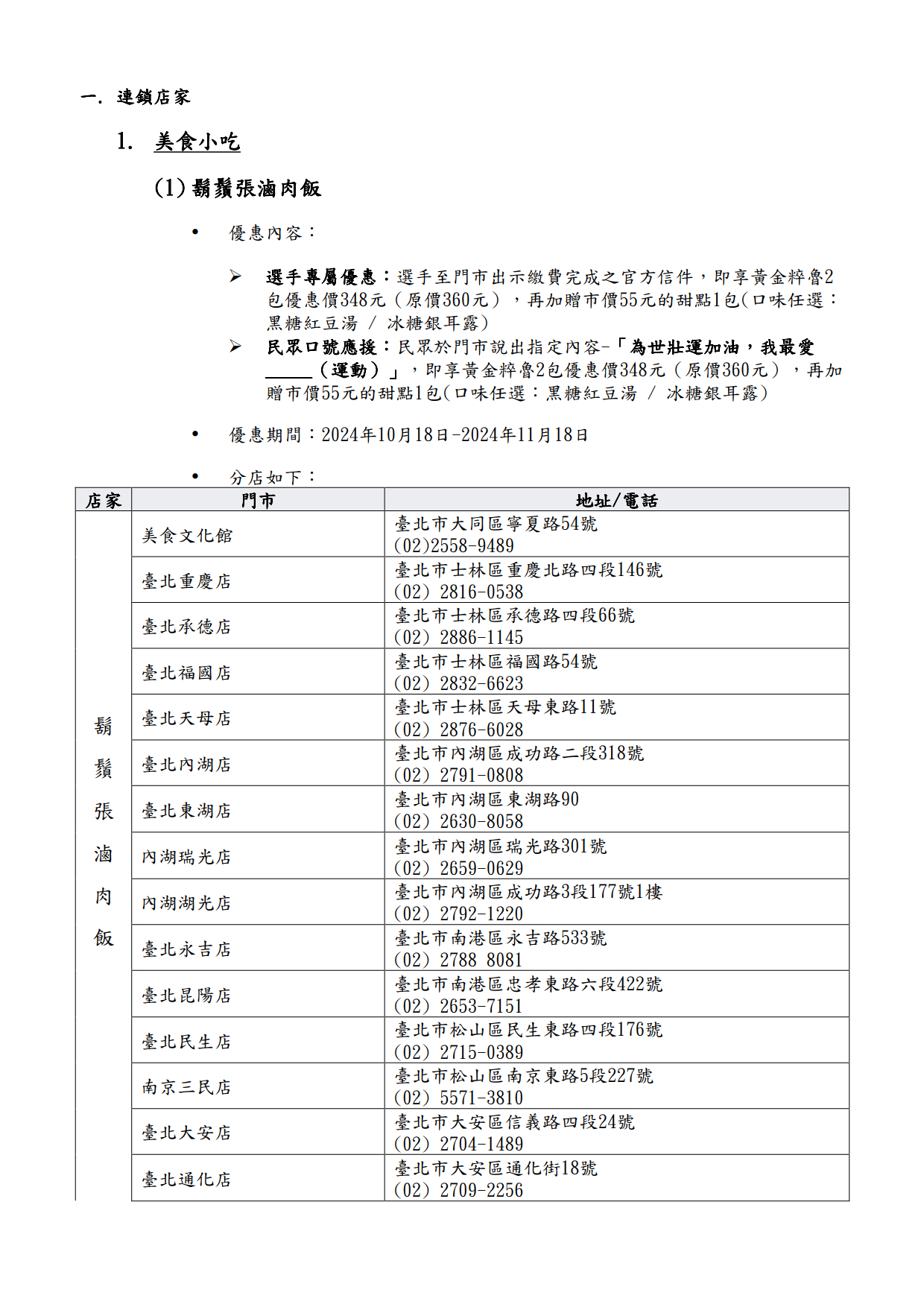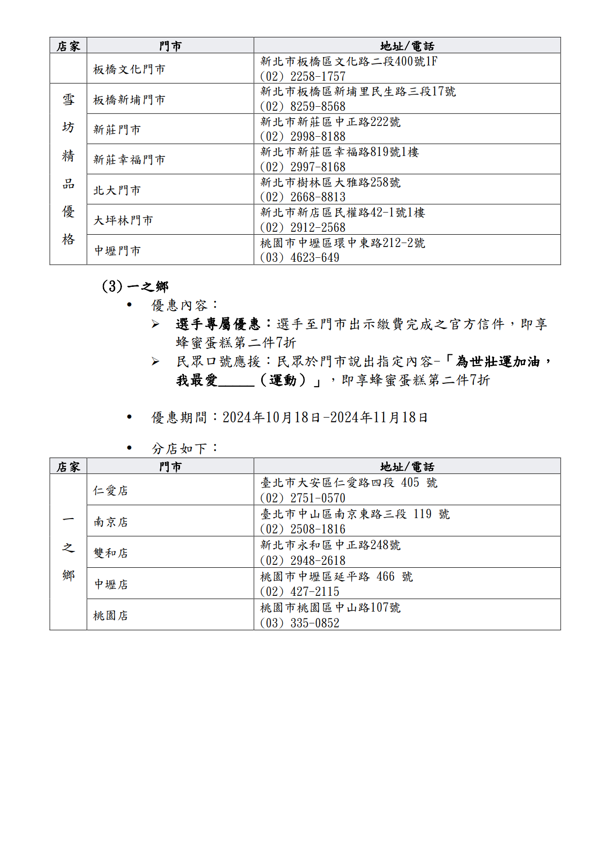 2025雙北世界壯年運動會將於114年5月17日正式起跑,為了迎接國內外的選手及觀光客,邀請臺北市、新北市、宜蘭縣、桃園市、新竹縣、新竹市之場館周邊店家及市場、夜市攤商攜手成為特約店家,共同為世壯運加油打氣,並提供一般民眾及選手專屬等多項優惠內容。