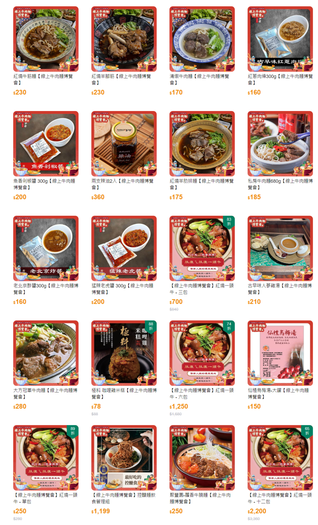 「線上牛肉麵博覽會」平台,協助30家知名牛肉麵店在iOPEN Mall上架促銷,讓消費者能輕鬆在線上選購各大名店招牌牛肉麵。只要動動手指,便能選購呈現經典味道的肚康風味「紅燒一頭牛」、榮獲2022年臺北國際牛肉麵節紅燒組冠軍的大方冠軍牛肉麵、2022臺北市牛肉麵國際大賞金牌獎的金牌牛肉麵、2022臺北國際牛肉麵節紅燒組銀獎的紅燒牛肉調理包、符合當今養生健康飲食觀念的台灣一品蕃茄牛肉麵、重新詮釋真正的紅酒燉牛肋法式餐點味覺饗宴的典藏紅酒燉牛肋。「線上牛肉麵博覽會」專區不只能買到經典牛肉麵,還可買到記憶中的傳統古早味紅蔥肉燥、獨特的「香、麻、辣」兩支辣油,還有嚴選食材、無防腐劑的古早味人蔘雞湯、口感濃郁香醇的極料麻油雞肉乾拌麵、秘製小魚乾辣椒醬…等,全是店家精選招牌好料。