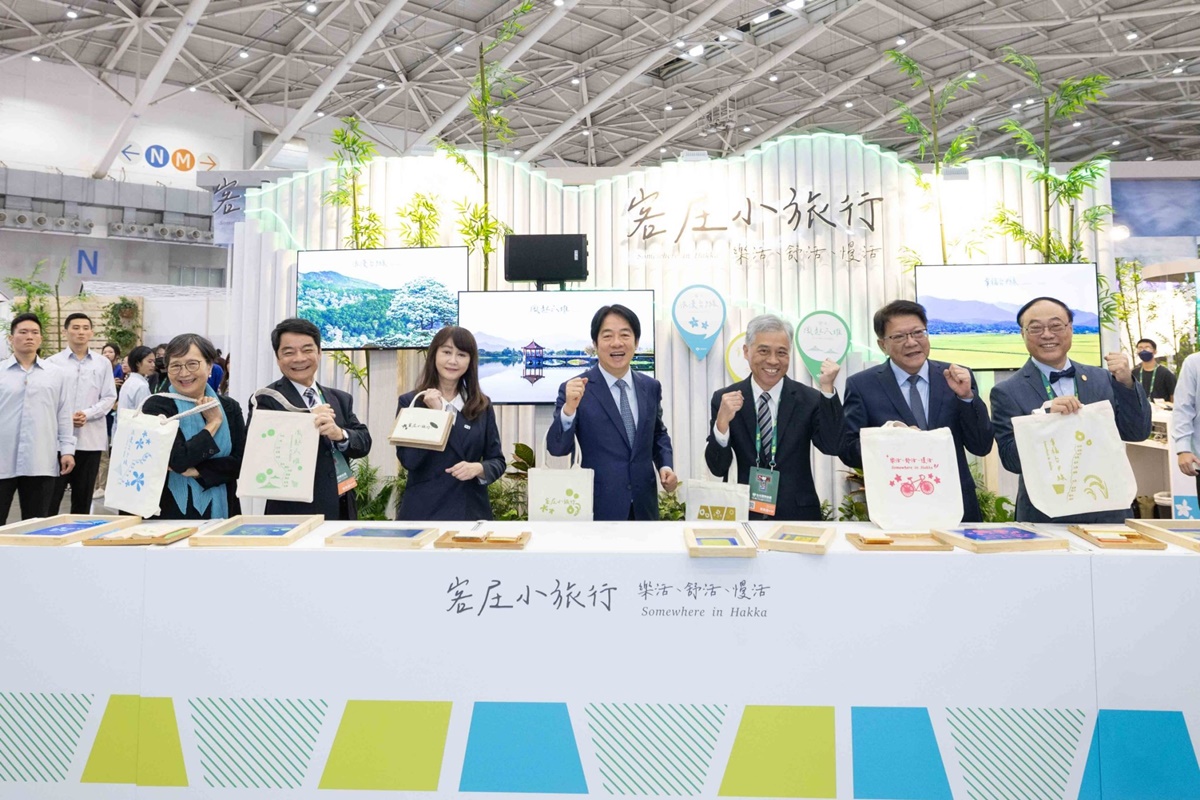客委會以「客庄小旅行」為核心主題,集結全台百大行程,推出浪漫台三線、風起六堆、幸福台九線等區域客家主題產品,請賴總統與貴賓體驗絹印,製作前往旅行的隨身小物;