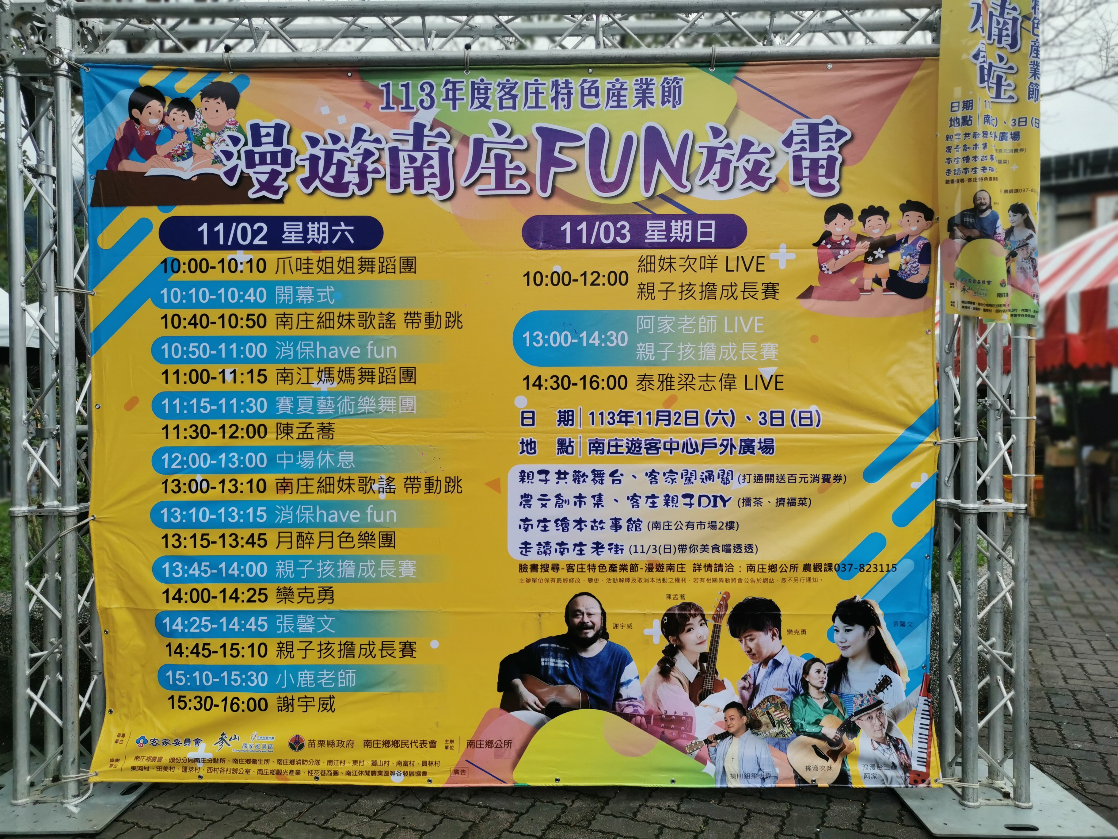 南庄鄉公所11月2日、3日在南庄遊客中心廣場舉辦客庄特色產業節-漫遊南庄系列活動,結合新住民、賽夏族、泰雅族、客家等多元族群文化、特有產物,並規畫繪本故事館,讓家長與孩子徜徉在故事世界中,提供各地遊客深度旅遊,感受客庄人文風情,體驗慢城魅力。