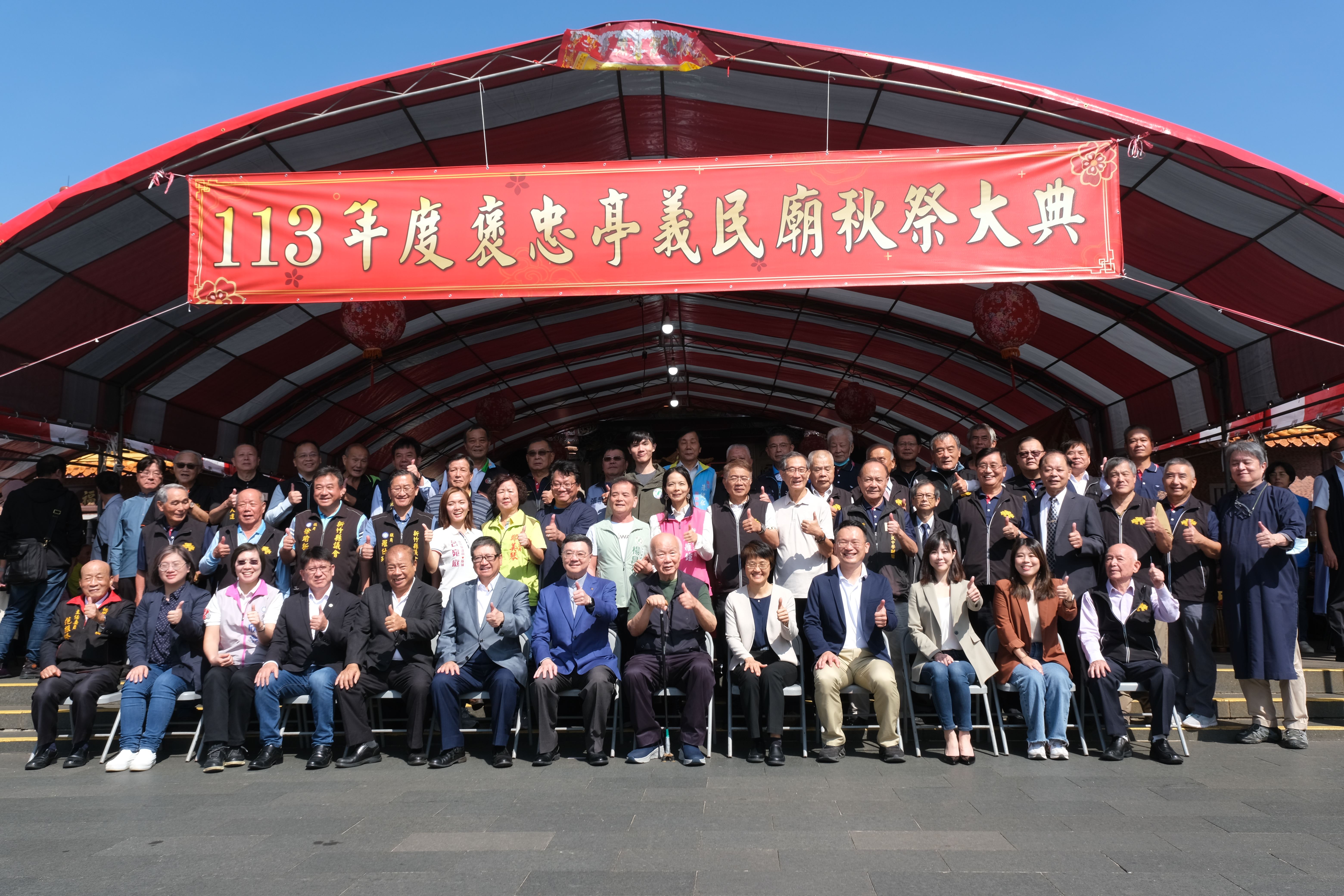 新埔褒忠義民廟11月3日舉辦113度義民廟秋祭大典,為褒忠亭義民廟的三大祭典之一,新竹縣長楊文科與行政院長卓榮泰、客家委員會主任委員古秀妃、桃園市副市長蘇俊賓及義民廟董事長林光華等人到場祈求國泰民安、風調雨順及地方繁榮發展。