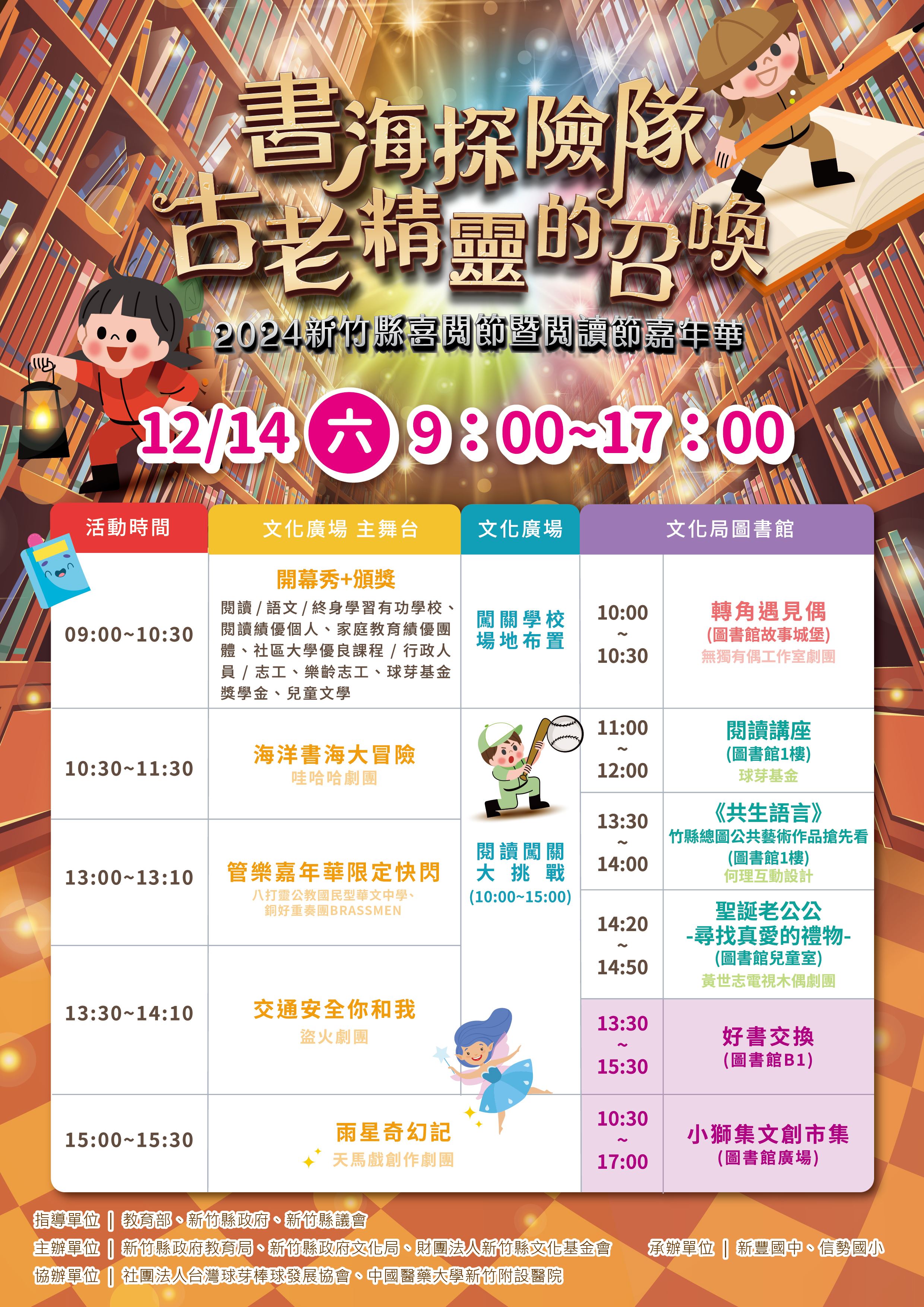 2024新竹縣喜閱節暨閱讀節嘉年華將於下周六(12月14日)在文化局圖書館廣場及文化廣場奇幻登場!從上午9時至下午5時規劃一系列活動,其中文化廣場上午10時至下午3時進行趣味闖關,將以世界各地圖書館為主軸,結合奇幻冒險的故事情節,邀請大小朋友們一起開啟一場從閱讀到實踐的知識探索之旅,尋找散落在世界各地圖書館中的古老精靈,感受閱讀的無限魅力!