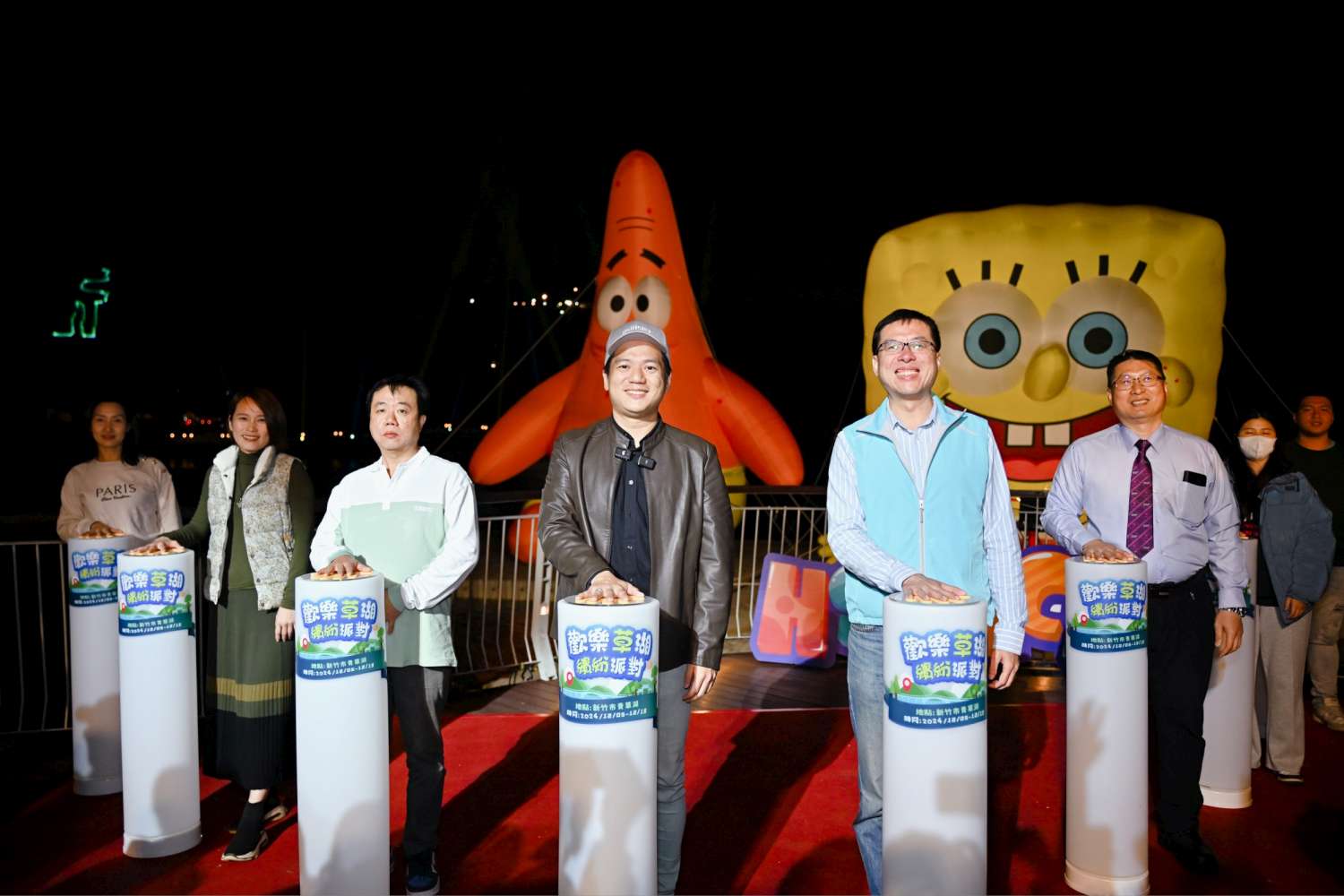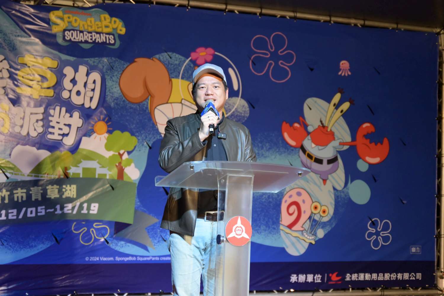 新竹市青草湖自12月5日起展開為期兩週的海綿寶寶「歡樂草湖 繽紛派對」,今(7)日舉行盛大的開幕活動,