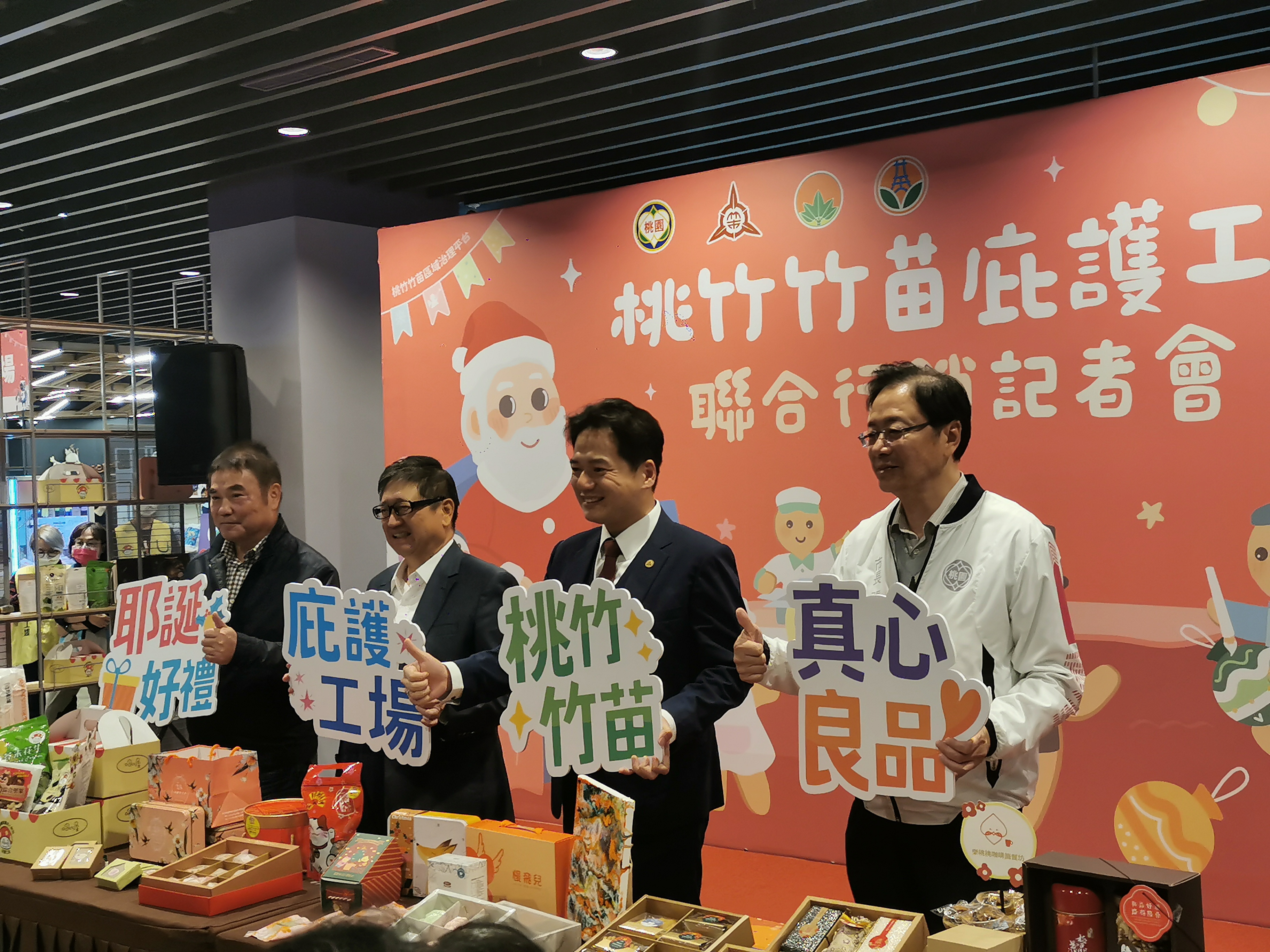 會議結束後,4首長隨即出席「桃竹竹苗庇護工場聯合品牌公益行銷活動」,由各縣市首長推薦桃竹竹苗11家在地庇護工場製作的產品,張市長推薦沁心小站庇護餐坊、路得啟智學園附設陪你走一段路生活坊、衛生福利部桃園療養院附設樂桃桃咖啡簡餐坊,以及財團法人桃園市美好社會福利基金會附設美好庇護工場等4處來自桃園的參展庇護工場。張市長表示,庇護工場推出食品、生活用品及文創商品等多元品項,鼓勵市民朋友以行動支持庇護工場春節精選禮品,讓更多人看見庇護工場朋友的努力,也讓身心障礙朋友獲得更多就業機會與照顧,攜手傳遞社會溫暖。