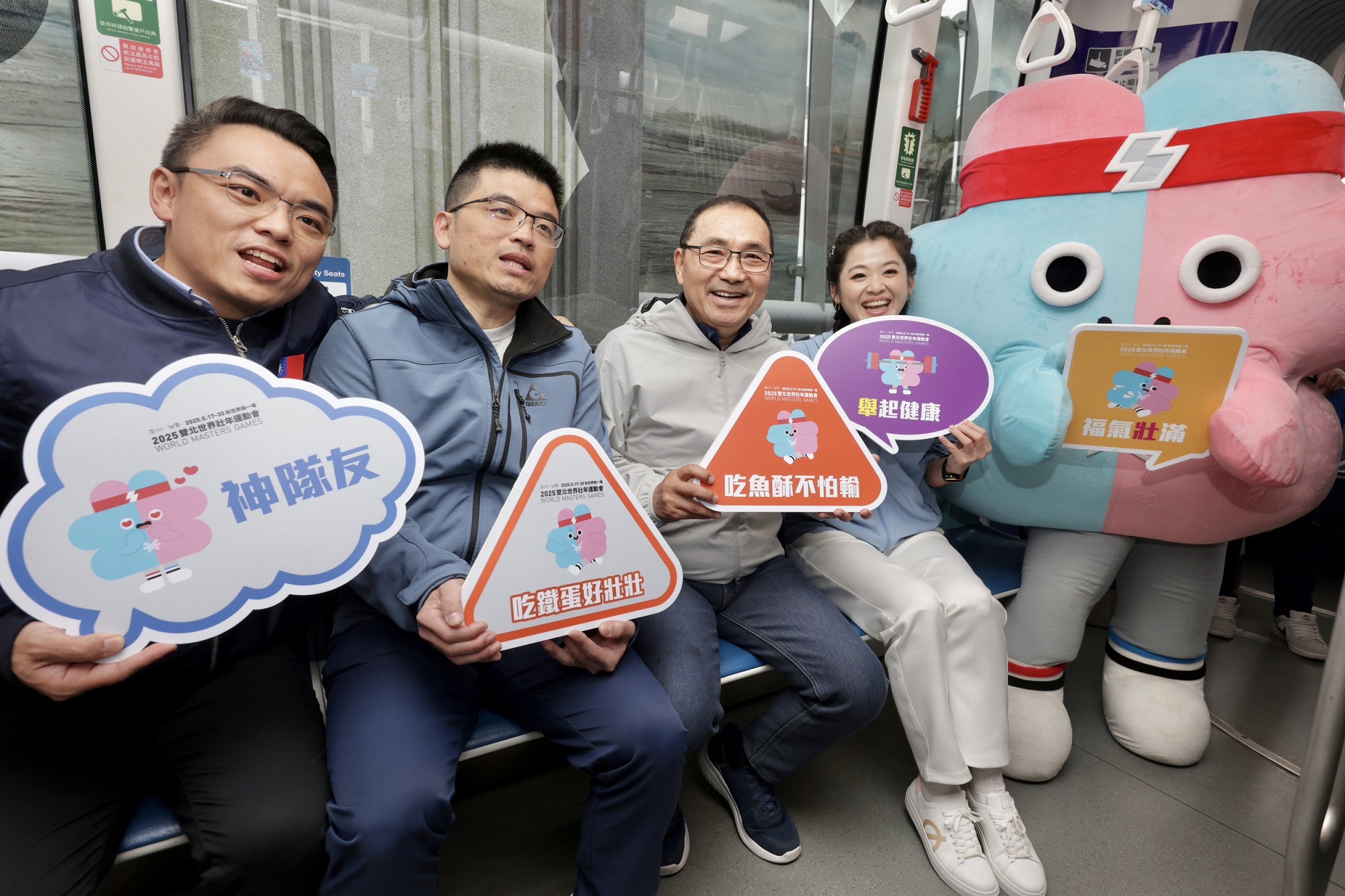 淡海輕軌壯寶列車首航,侯友宜和壯寶一起搭乘 圖/新北市政府體育局提供
