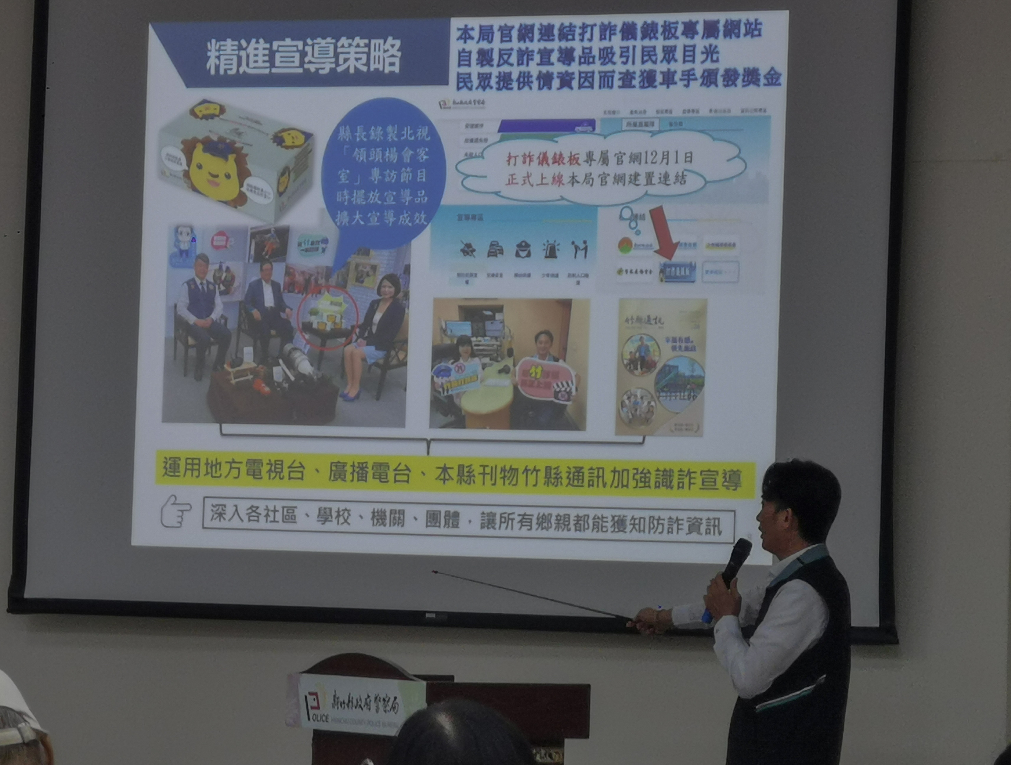 有鑑於詐騙件數及財損數未有明顯下降趨勢,新竹縣警局持續精進宣導策略,結合各局處成立「打詐竹縣隊」實施反詐宣導,於辦理活動場合派員加強宣導,並運用在地電視台、廣播電台及縣府刊物等加強推播防詐訊息。