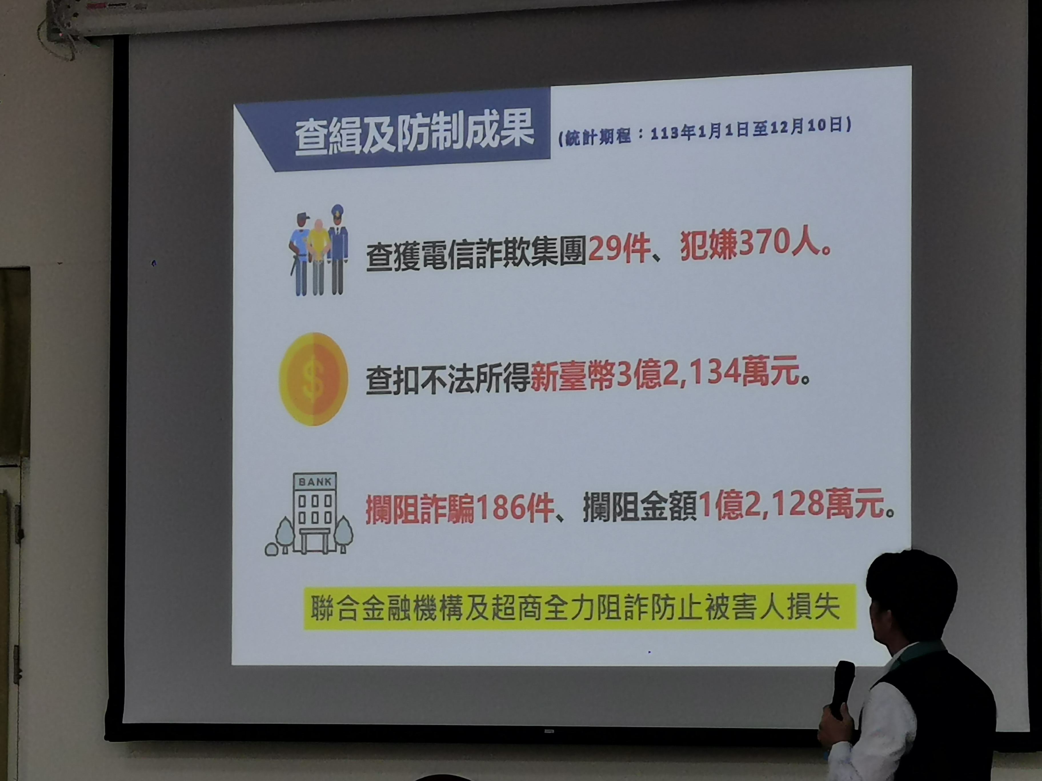 此外,竹縣警察同仁打詐及反詐不遺餘力,統計113年1月至12月10日「打擊詐欺」成效,查獲詐欺集團29件370人、查扣不法利得新臺幣3億2,134萬餘元;至於「防制詐欺」面向,成功攔阻詐騙186件、攔阻金額達新臺幣1億2,128萬餘元,成果豐碩。