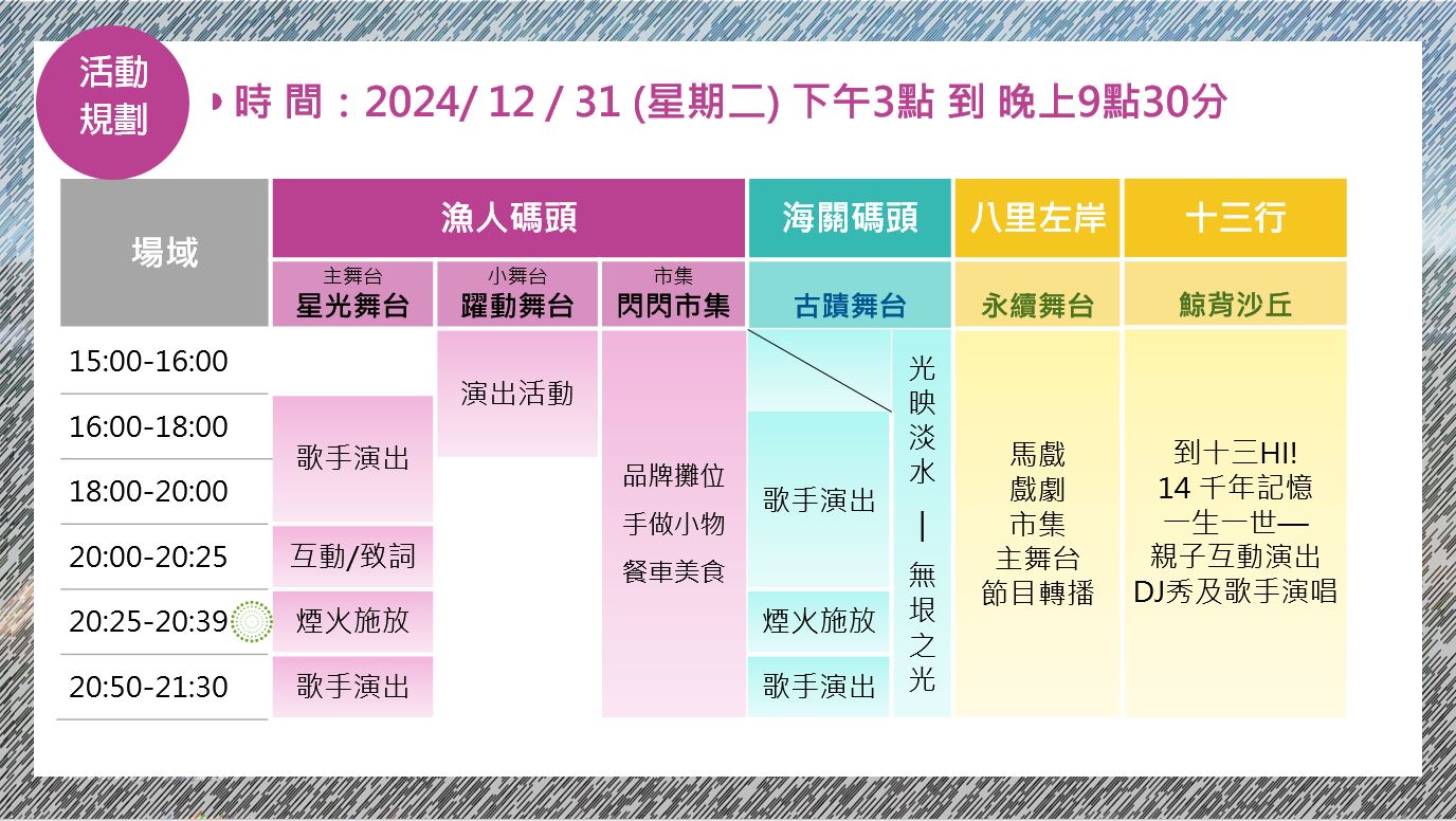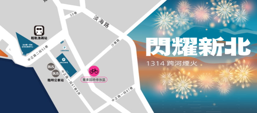 2025閃耀新北1314跨河煙火活動」煙火秀將於12月31日在漁人碼頭登場,當天下午3時起就有一系列表演活動,晚上8時25分並將施放長達14分鐘的海景煙火,預計將吸引超過5萬人觀賞,交通局籲請民眾搭乘捷運、公車等大眾運輸前往賞煙火,便捷又盡興!