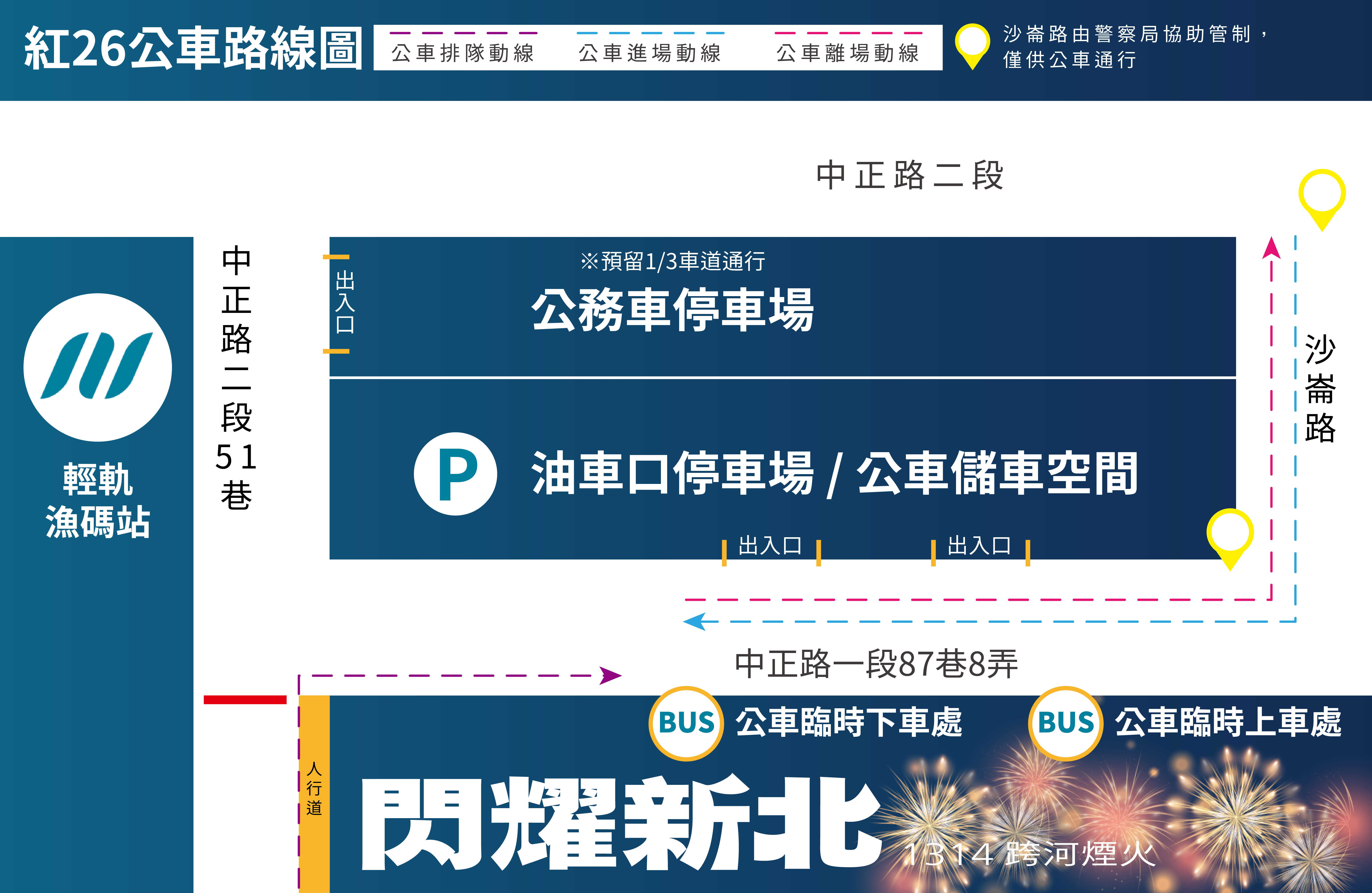 同時,公車紅26動線自下午4時起實施交通管制期間至收班前調整為中正路二段(工區)/沙崙路「雙向單線」進出,取消雙邊停靠「淡水漁市」、「漁人碼頭」、「輕軌漁人碼頭」、「紅十字會」、「淡海中正路口」、「淡海」、「淡海市民活動中心」等 7 站,而「天生國小」、「淡江新村」、「世界觀」等3站則取消往捷運淡水站方向站位,改為單邊停靠;晚上8時30分至隔日凌晨0時取消停靠「重建街口」往捷運淡水站方向站位,加速疏運。