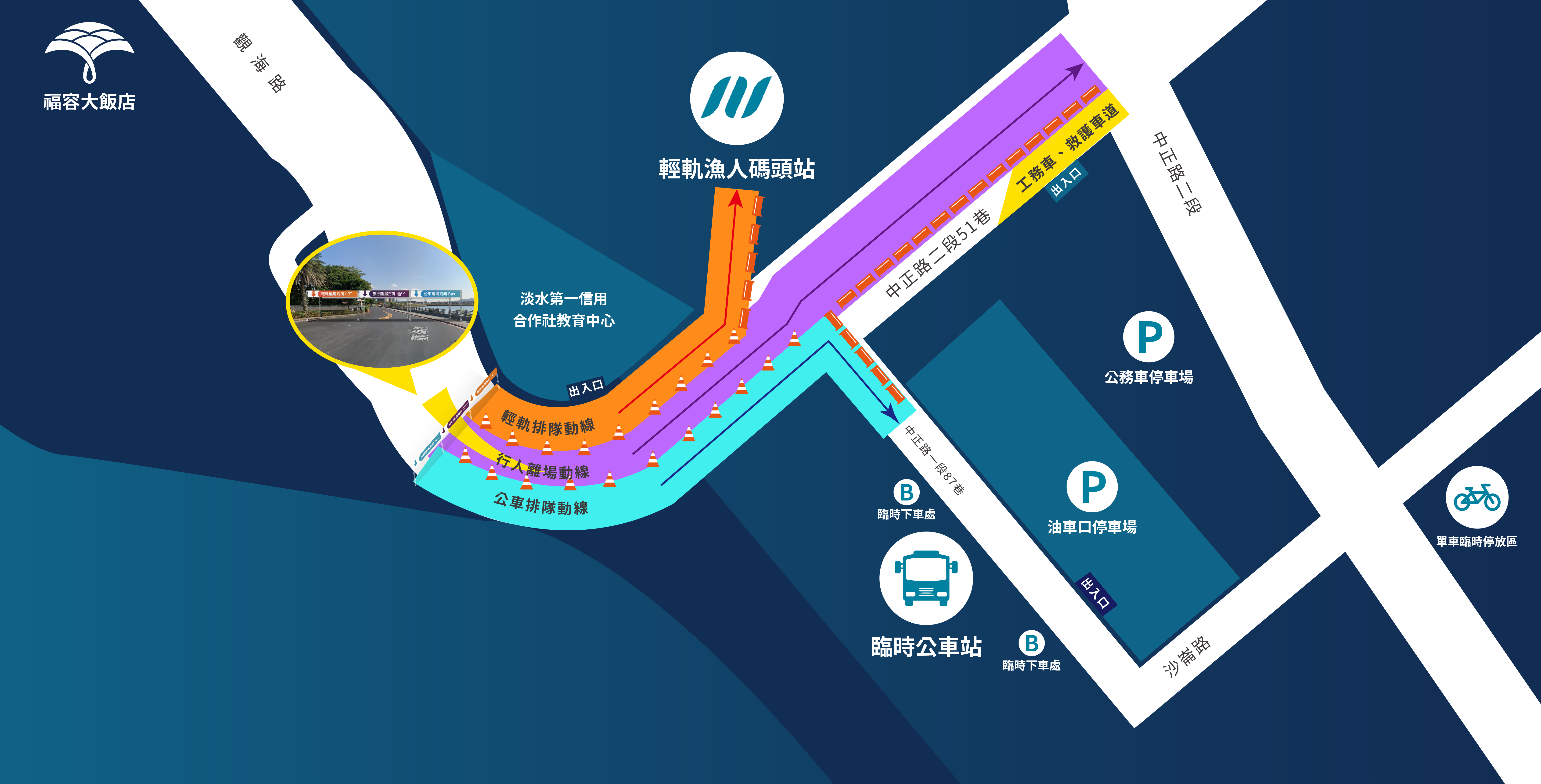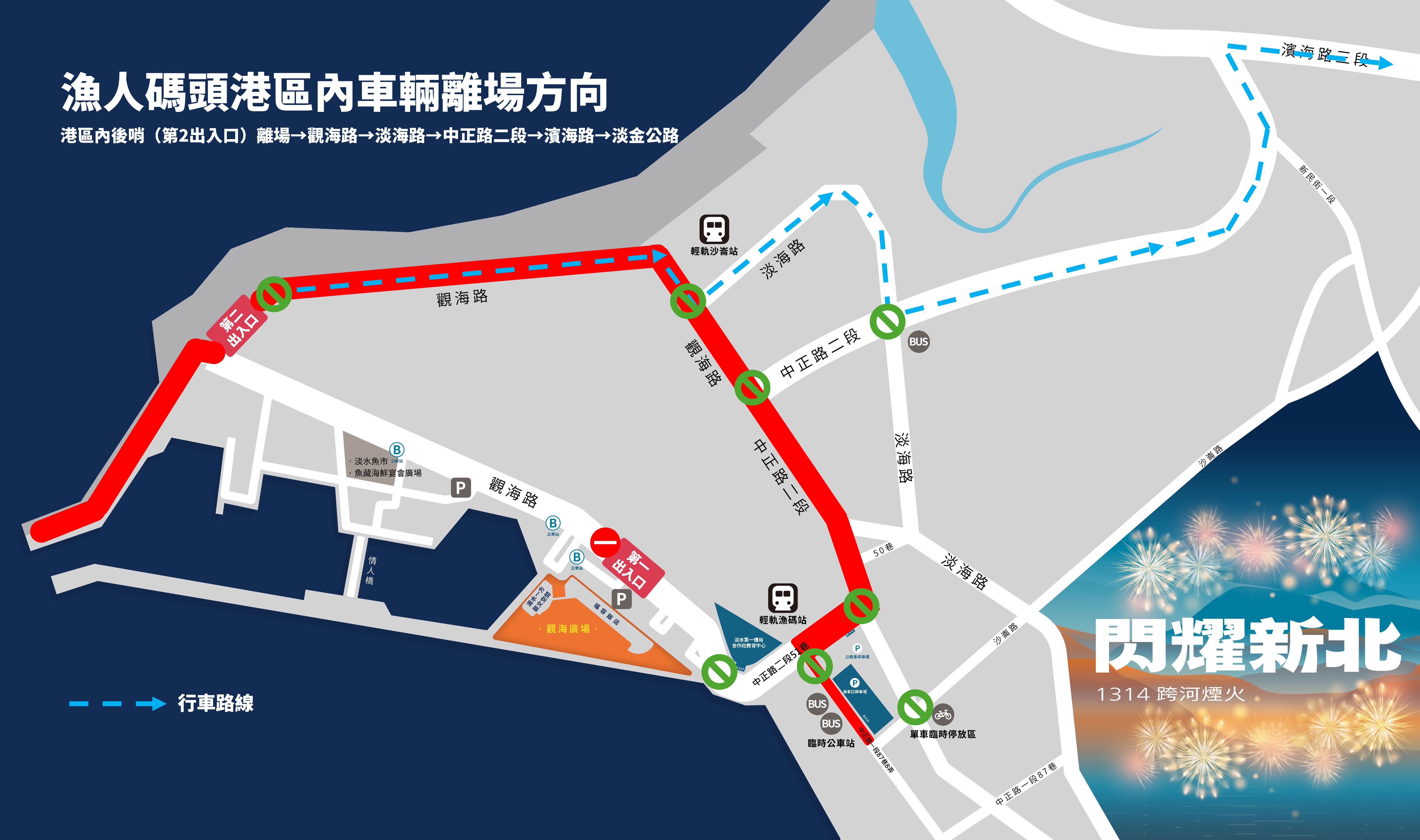 交通局也提醒淡海輕軌等淡水、八里端周邊大眾運輸於散場時都將配合加開班次,加強疏運;本次淡水端離場動線將調整為由港區內後哨(第二出入口)離場後,再由觀海路-淡海路-中正路-濱海路-淡金路(觀海路轉淡海路調撥車道)離開;另外八里端開車民眾請利用台64往市區行駛,避開龍米路一段及成泰路三段易壅塞路段。