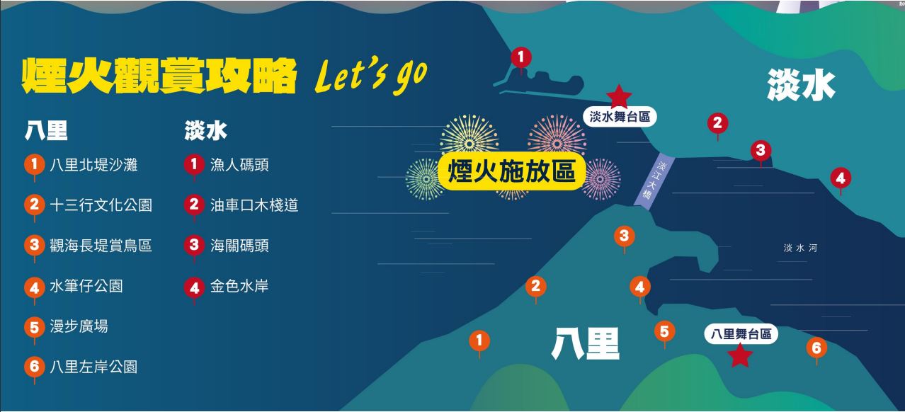 交通局呼籲民眾可搭乘捷運至淡水站步行或轉乘紅26公車,亦可搭乘捷運至紅樹林站轉搭淡海輕軌至漁人碼頭站;要到八里沿岸觀賞煙火的民眾,則可搭乘捷運至蘆洲站轉搭704公車或關渡站轉乘紅22及紅13公車至八里。