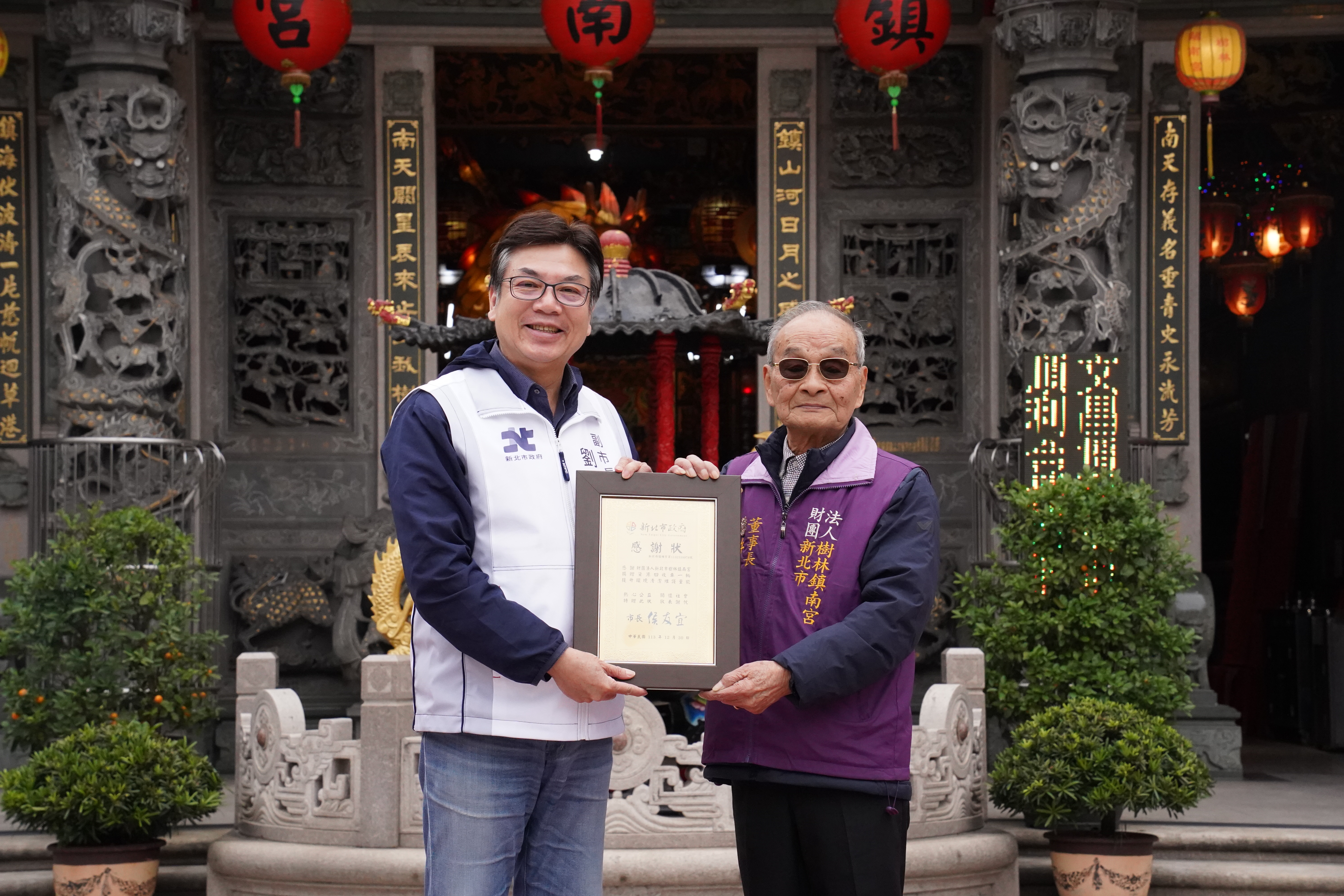 劉和然副市長致贈感謝狀,感謝鎮南宮捐贈資源回收車(董事長許正秋) 圖/新北市環保局 提供