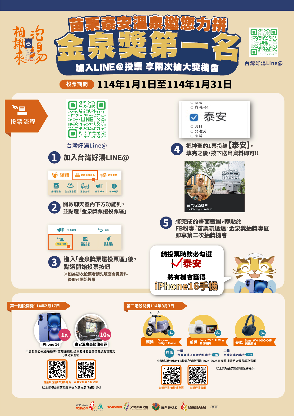 交通部觀光署舉辦「台灣好湯~金泉獎」票選活動,即日起自114年1月1日至114年1月31日止6開放網路票選,投票即可有機會獲得iPhone14手機及住宿券等大獎,呼籲大家唯一1票投給「泰安溫泉」,把榮耀留在苗栗!