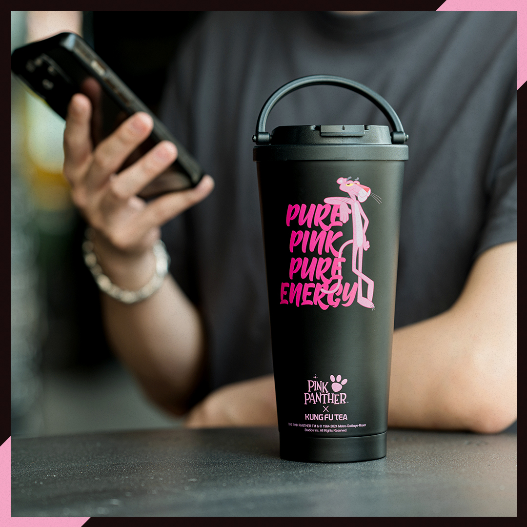 ▲功夫茶攜手頑皮豹,推出超搶眼黑粉色系聯名。(圖/KUNG FU TEA功夫茶提供)