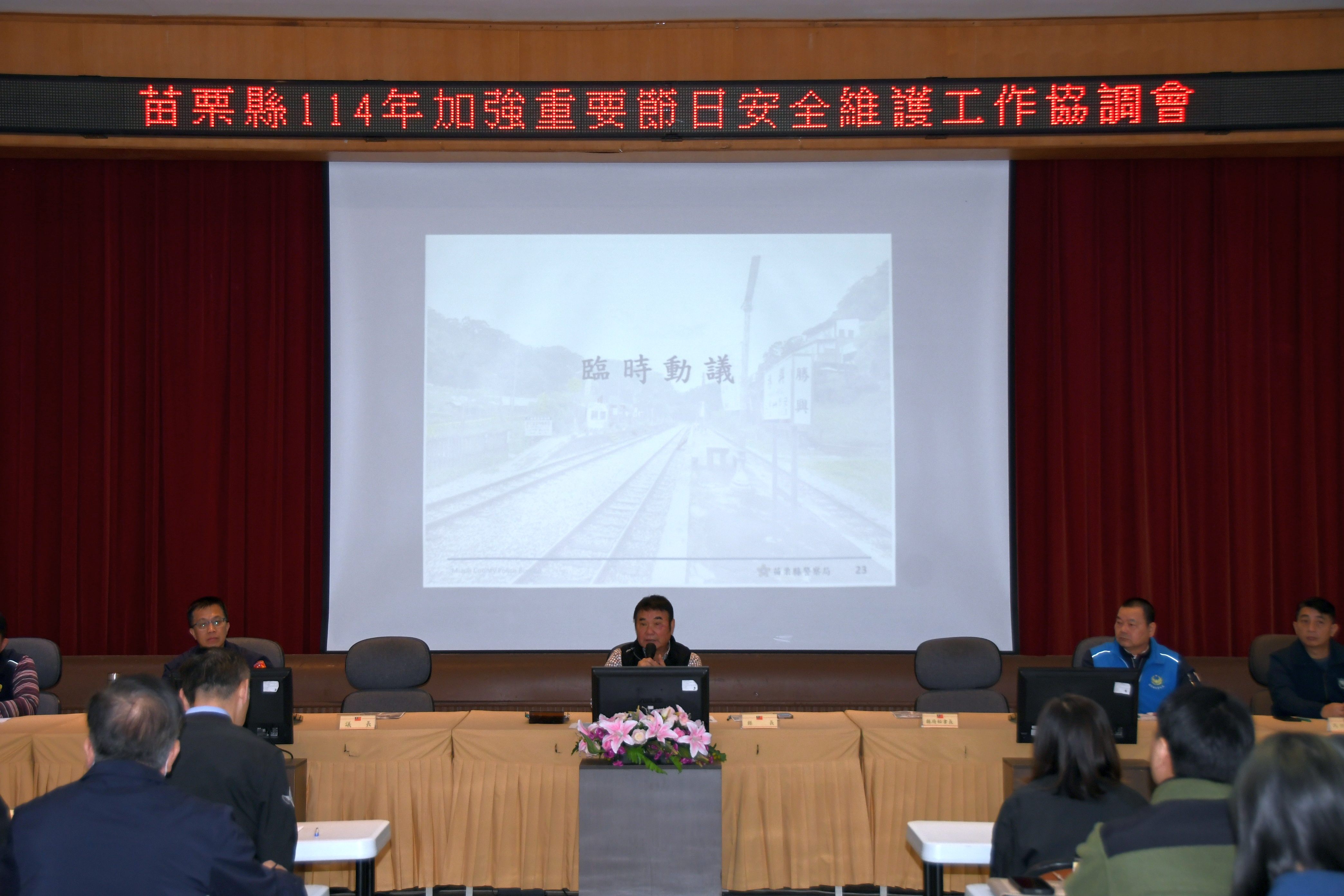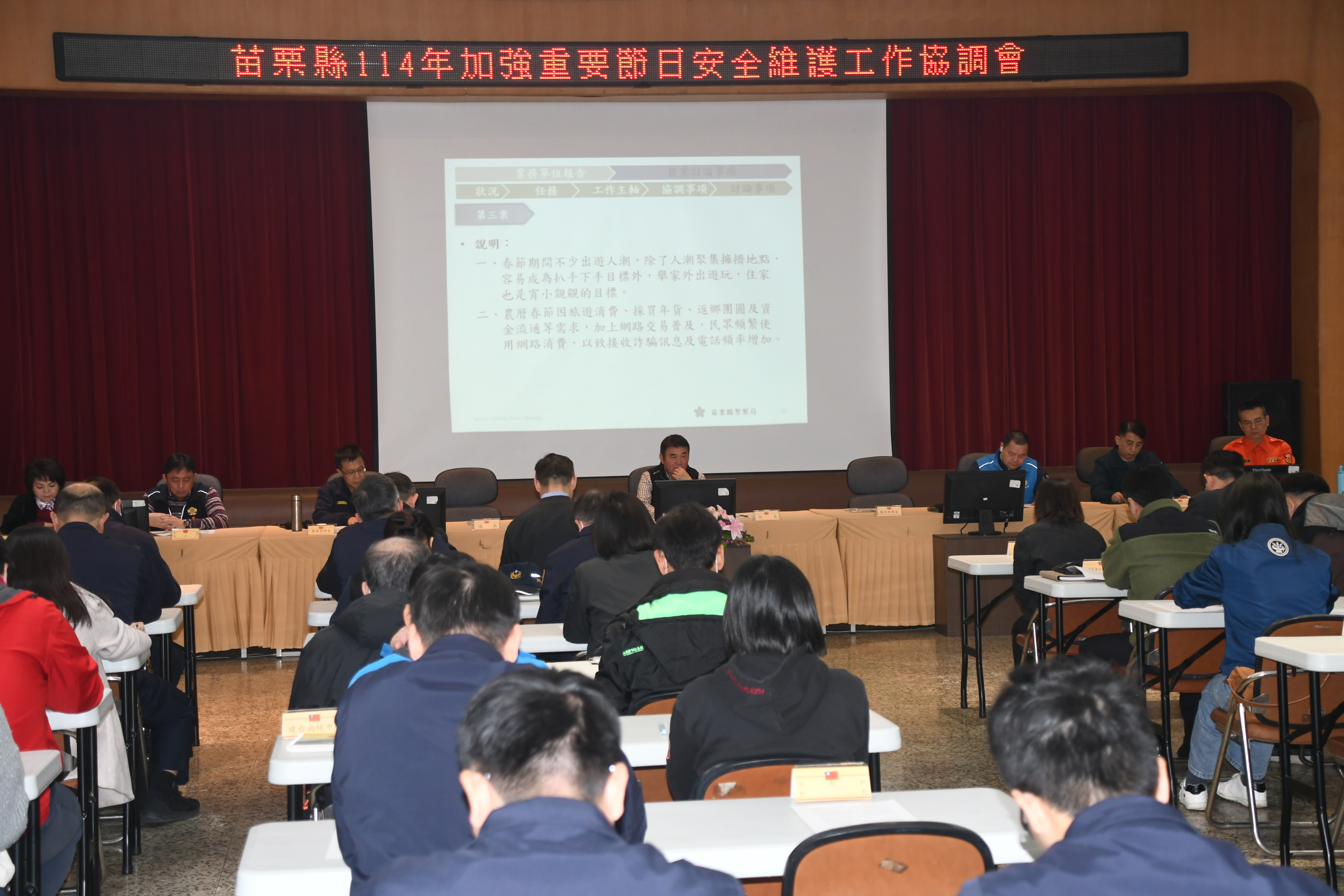 114年加強重要節日安全維護工作自114年1月20日22時起至2月3日24時止,為期15日,苗栗縣政府為展現維護治安、整頓交通的決心,並加強警政服務工作,1月2日10時在警察局3樓禮堂,邀集縣府相關局處、學校、金融機構、民力團體等單位,召開工作協調會,由縣長鍾東錦主持,預計投入警察、義警、義交、民防、守望相助隊、志工及協勤民力等2萬餘人次。
