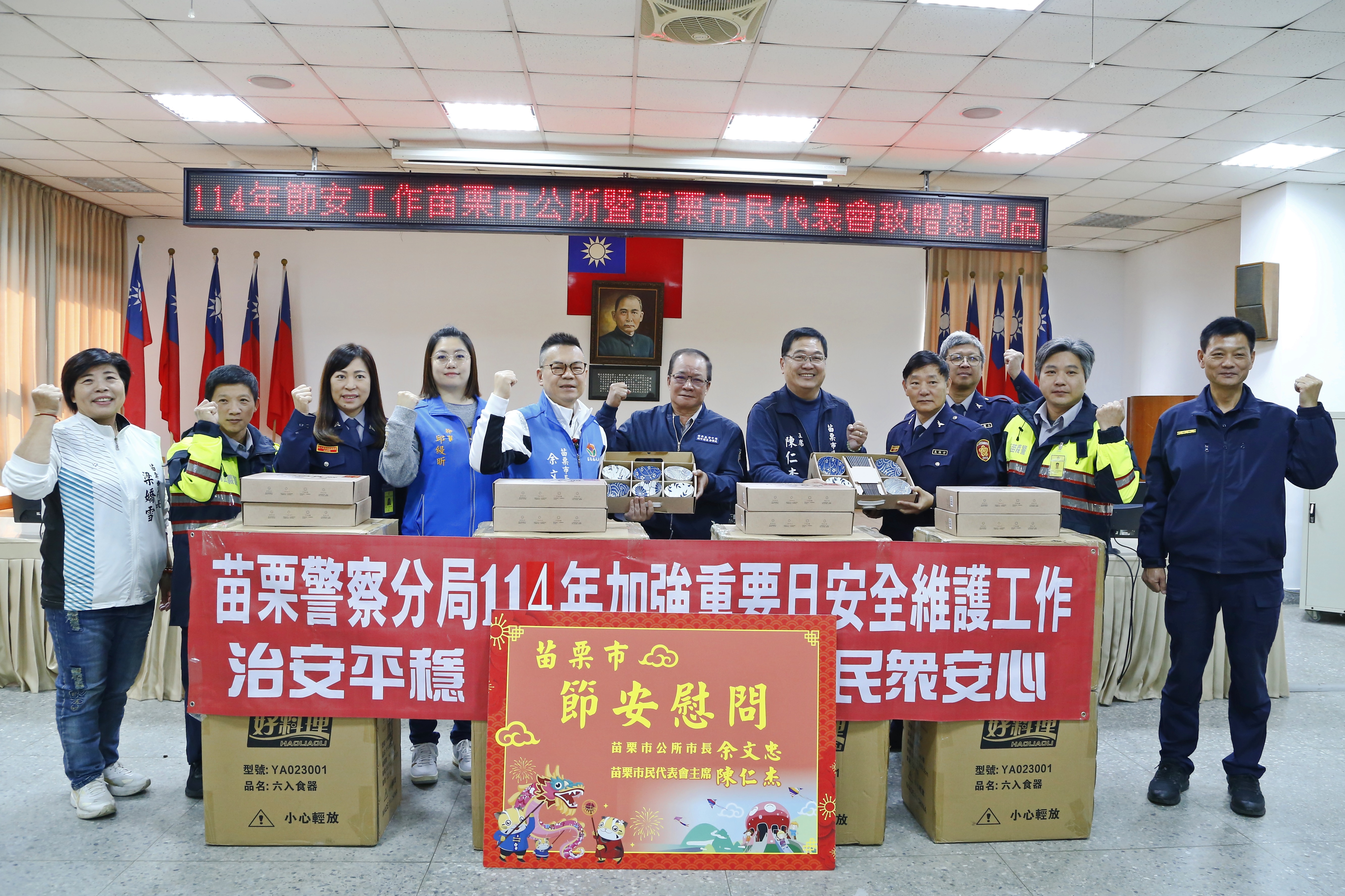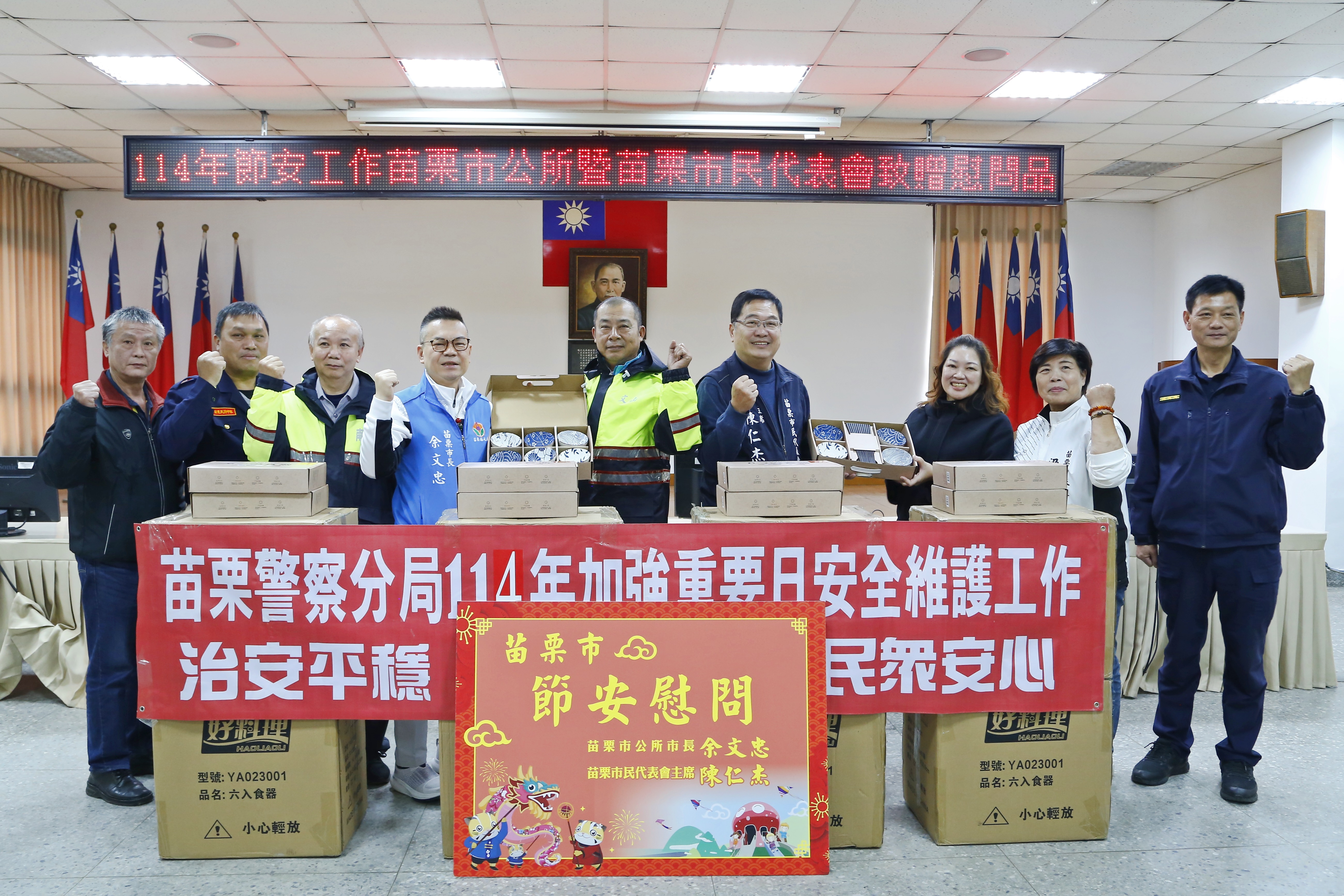 為了感謝警力民防弟兄們任勞任怨的付出,激勵工作士氣,市長余文忠暨代表會主席陳仁杰帶領公所同仁於8日特別前往苗栗警察分局勤務中心、偵查隊、警備隊、巡守隊發放慰問品,親自慰勞加油打氣,並提早向大家拜年,現場氣氛熱鬧溫馨滿懷。苗栗分局分局長潘嘉旺也呼籲民眾,「警力有限、民力無窮、警民合作、共創平安家園」若遇突發狀況或可疑分子,隨時通報當地警察機關,以防範犯罪。