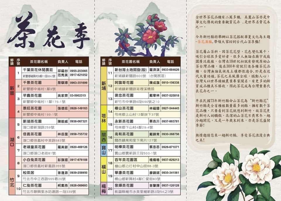 新竹縣茶花園藝研究學會彙整縣轄內新埔、新豐、竹北、湖口、芎林、竹東、寶山、關西及橫山等共計20處之私人茶花園區相關資訊,提供民眾來趟-浪漫竹縣茶花遊,除開放茶花園供觀賞外,並提供茶花盆栽展售,讓民眾可以按圖索驥就近參訪茶花園,體驗茶花之美。