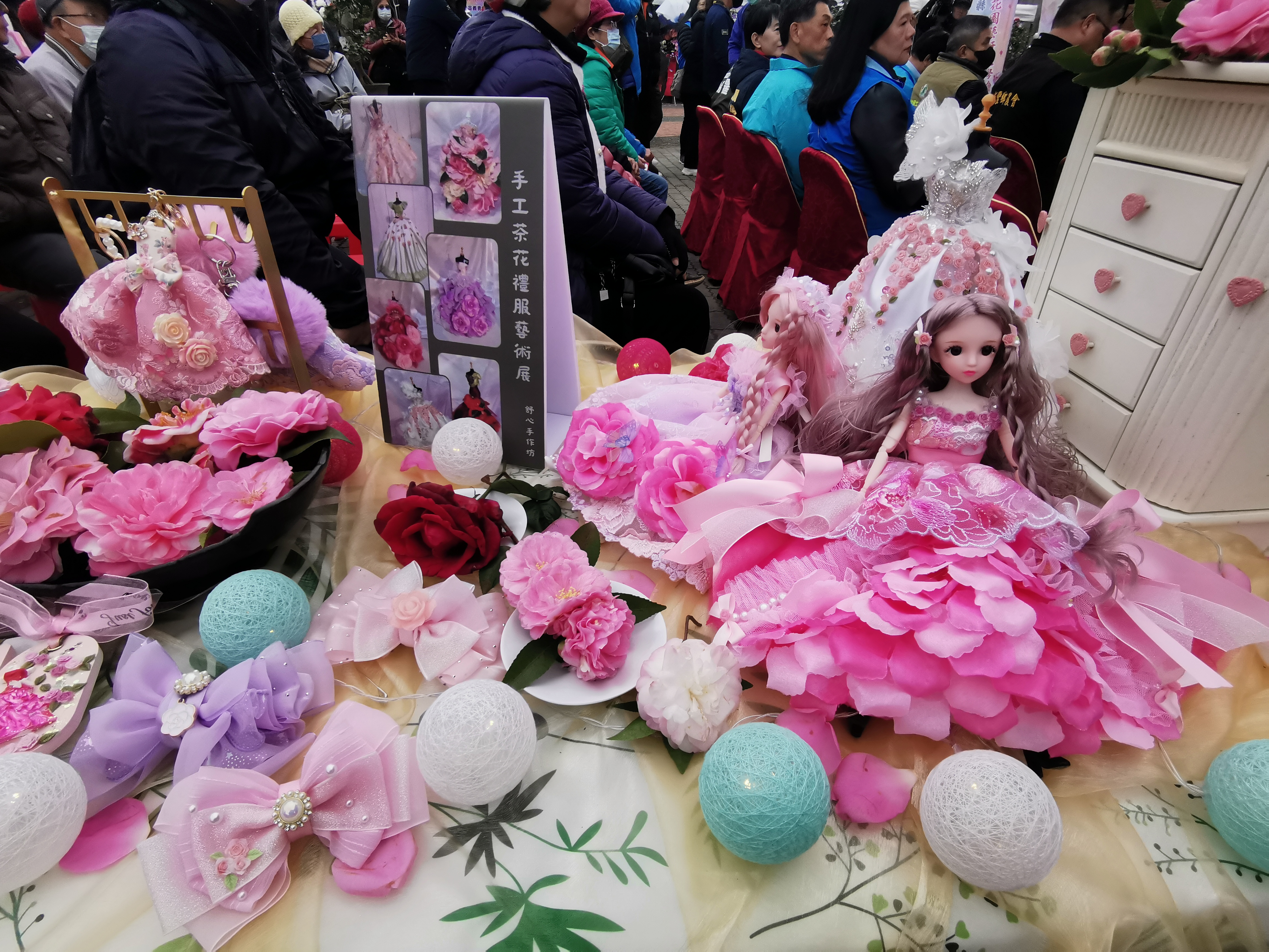 縣府農業處傅琦媺指出,這次開幕首日透過西洋風格展現設計多元展出模式,邀請棠欣婚禮顧問公司合作,以臉部茶花彩繪禮服走秀方式呈現,將茶花藝術與西洋婚紗時尚巧妙結合,帶來前所未有的視覺震撼與獨特氛圍。還有呼應婚紗禮服展出模式,邀請林玉枝(亮亮)老師精緻手作六件迷你茶花創作禮服作品在美術館展出。