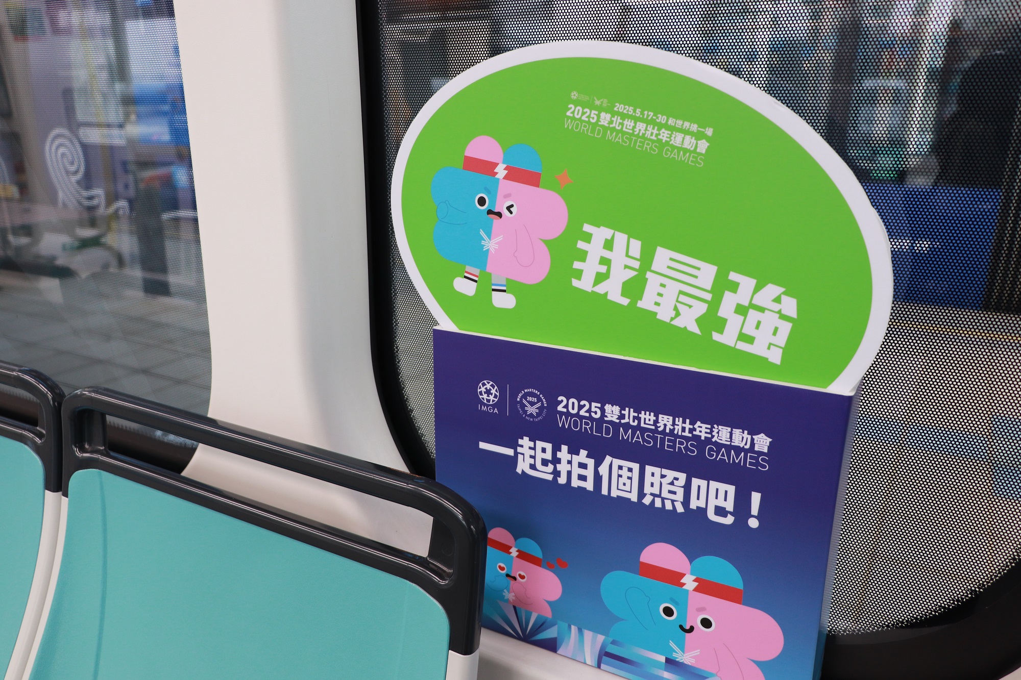 淡海輕軌壯寶列車上設置創意手舉牌供民眾拍照留念. 圖/新北市體育局提供