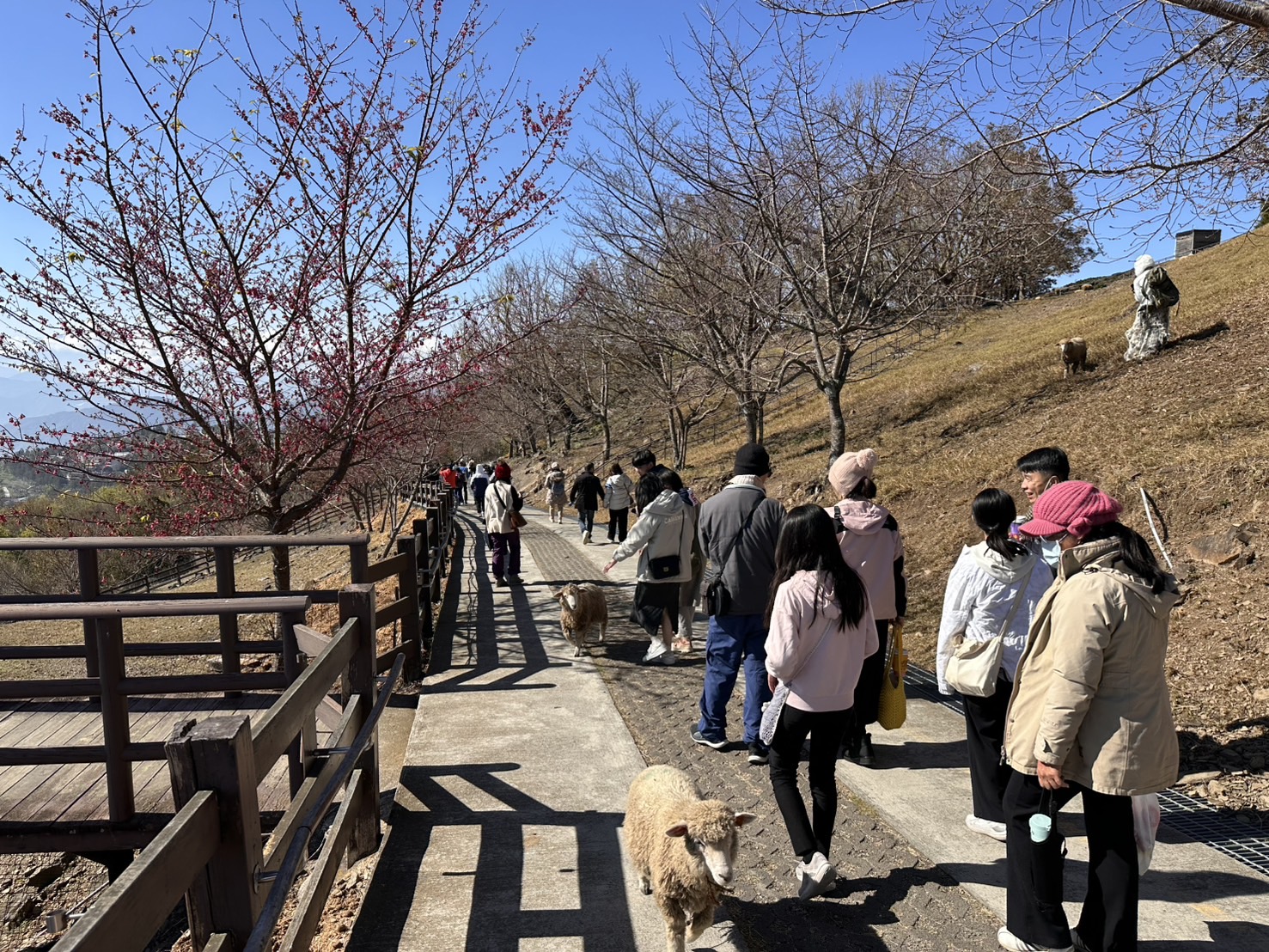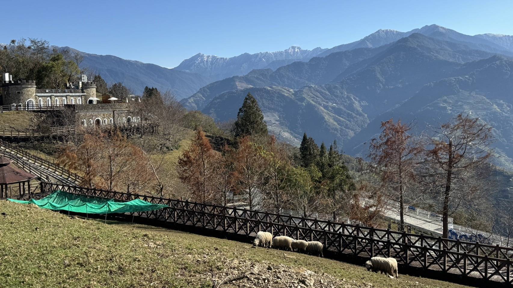 清境農場位於台14甲8-10公里處,正好位於中央山脈的心臟地帶,往東可以看到合歡、奇萊、能高越嶺古道等名山,往西則是瑞岩溪流域,有紅香部落以及白姑大山等,冷氣團讓一路迤邐的北三段高山都白了頭,許多民眾抓緊機會,就是想要亞熱帶的台灣可以享受到白雪靄靄的北國風貌;清境農場表示,其實從園區內,就可以清楚看到為雪白頭的群山,不用冒著刺骨寒風,還可以跟綿羊馬匹一起徜徉在櫻花步道之中,是最好的親子冬季旅遊活動。