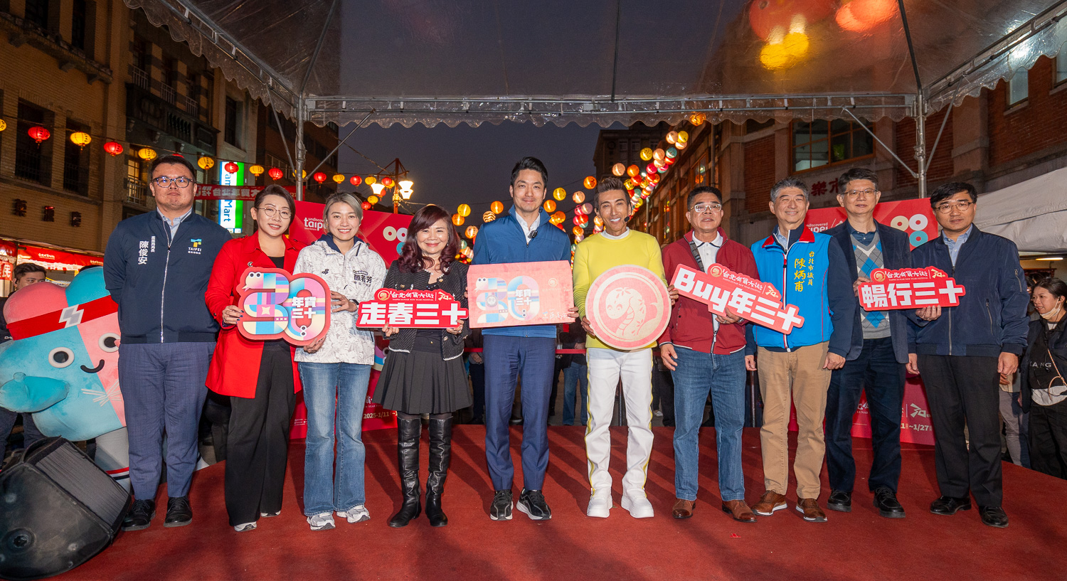 「2025台北年貨大街」於1月11日至27日熱鬧登場,為歡慶30週年,1月14日蔣萬安市長與有氧天王潘若迪一同現身迪化街商圈,透過充滿青春能量的舞蹈搭配活動口號,為匯集特色老店的迪化街注入無限活力;蔣市長並現場發送「年貨三十」蛇年限定發財金向民眾互動拜年,傳遞新年祝福,祝大家好運蛇進來!