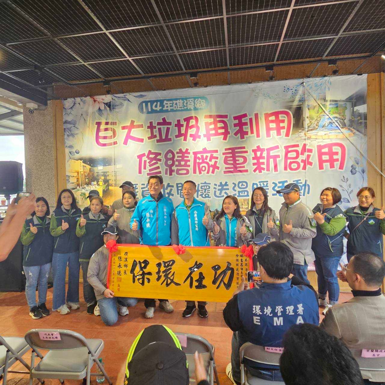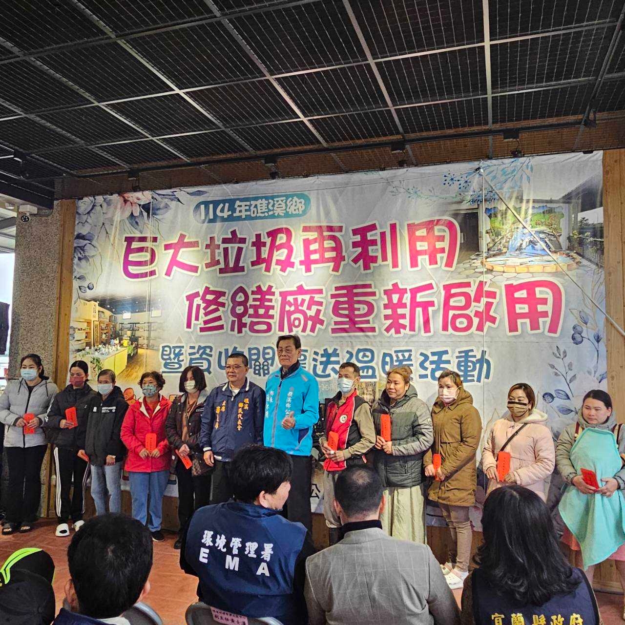 礁溪鄉公所1月15日上午於巨大垃圾再利用修繕廠辦理廠區重新啟用暨資收關懷送溫暖活動,環境部環境管理署北區中心黃士漢副主任、宜蘭縣環保局許嘉琦局長、鄉民代表會游見璋主席等11位代表、18村村長及社區理事長均蒞臨指導及鼓勵,在農曆歲末之際,表達對弱勢家庭及資收個體戶的關懷,宣導資源循環再利用之理念!