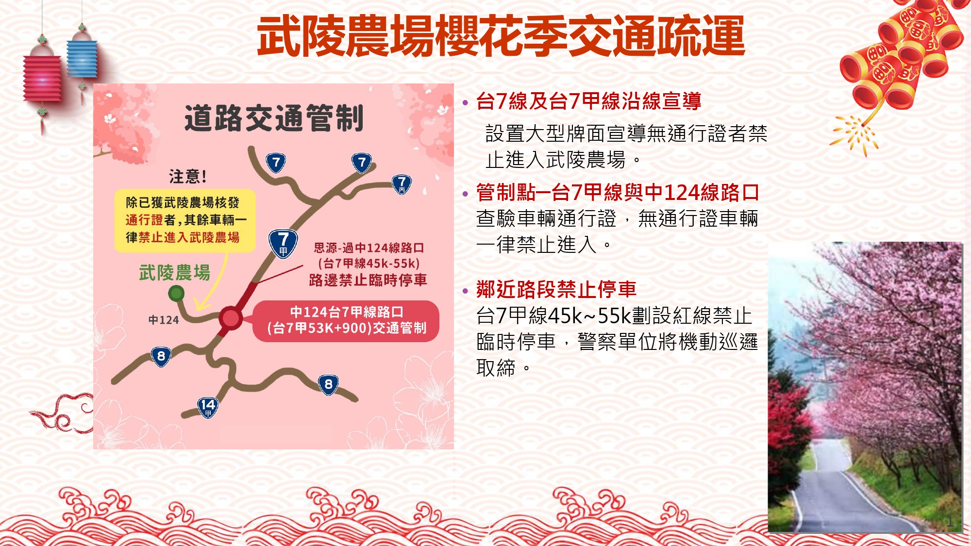 另114年度武陵農場櫻花季疏運期間自114年2月8日至2月23日止,共計16日,臺北區監理所提醒因道路管制及車輛總輛管制,可多加利用國光客運由臺北、市府轉運站、宜蘭、羅東、三星等5條公共運輸賞櫻專車前往武陵農場,讓賞櫻行程安全又順心。