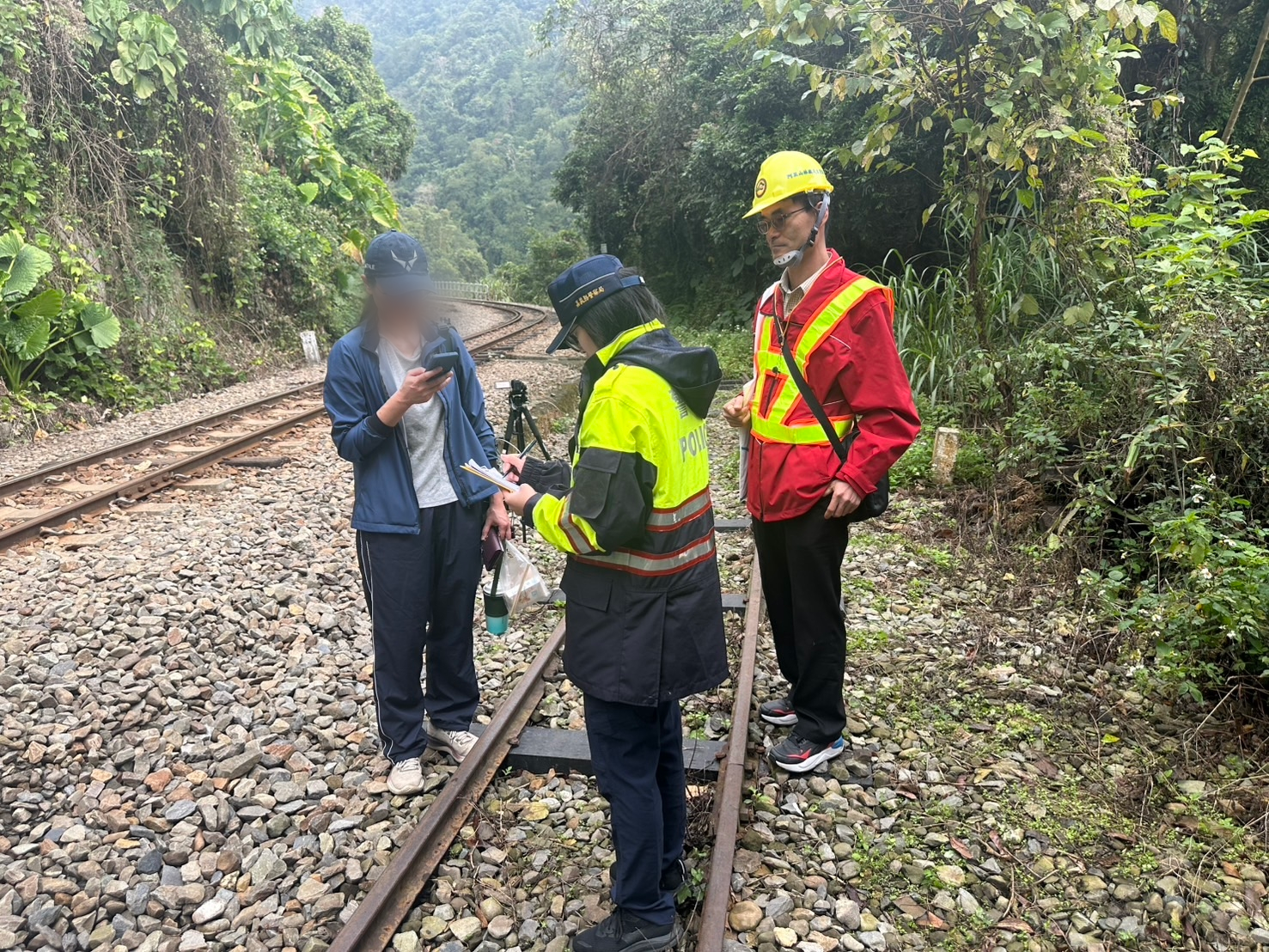 林鐵及文資處會同警方取締遊客行走軌道,警方製作訪談紀錄 圖/農業部林業及自然保育署阿里山林業鐵路及文化資產管理處提供