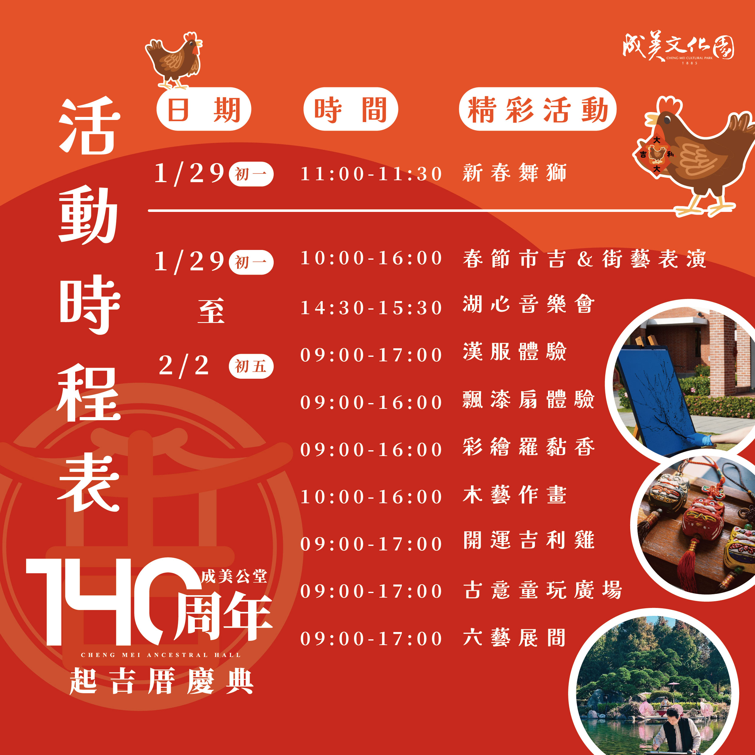 首波「起吉厝慶典」慶祝活動自1/29展開,一直到2/2為期5天,家的閩南語發音接近「雞」與「吉」,寓意為大吉大利,活動期間將有上百隻可愛的吉利小雞氣球於園區出沒。活動特色也呼應早期台灣社會,養雞是一個家庭富足的表現,成美文化園希望傳達分享的概念,將福氣分享給每位來訪的遊客。