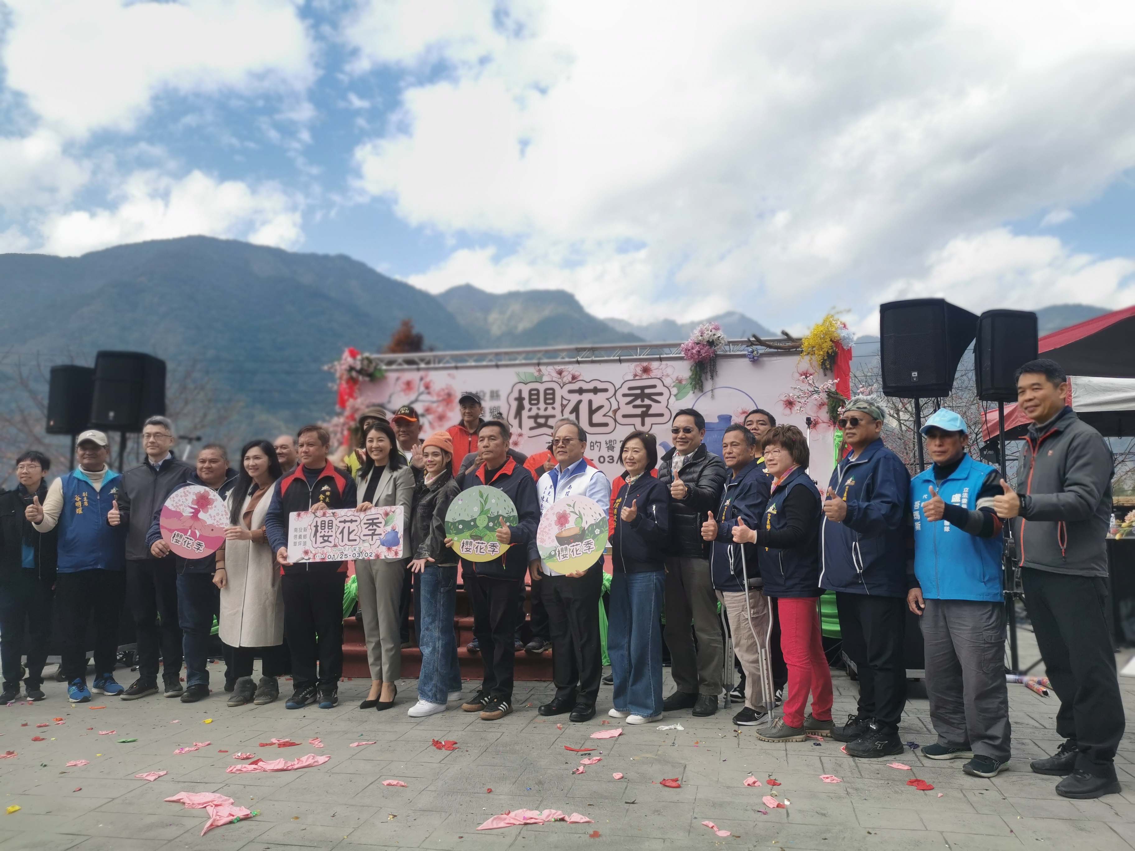 2025年信義鄉櫻花季活動「花與茶的饗宴」登場,縣府22日在草坪頭第五停車場舉辦開幕活動,縣長許淑華 與縣議員全文才、#信義鄉長全志堅 等出席貴賓,一同宣布櫻花季開始。