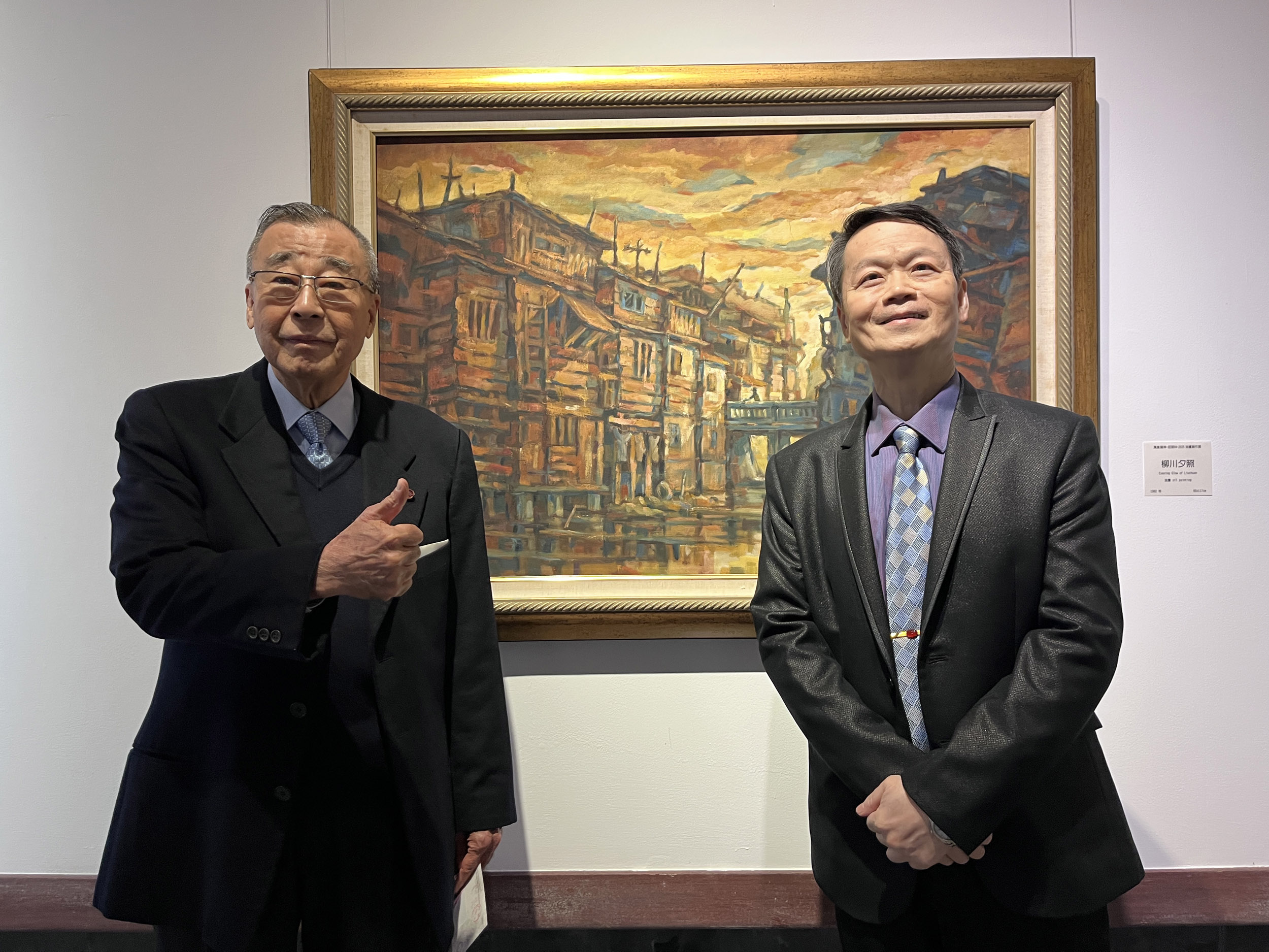 前總統府資政廖了以(左)今日參加莊明中(右)個展開幕式,並在省展入選作品《柳川夕照》前合影 圖/ 臺中市港區藝術中心提供