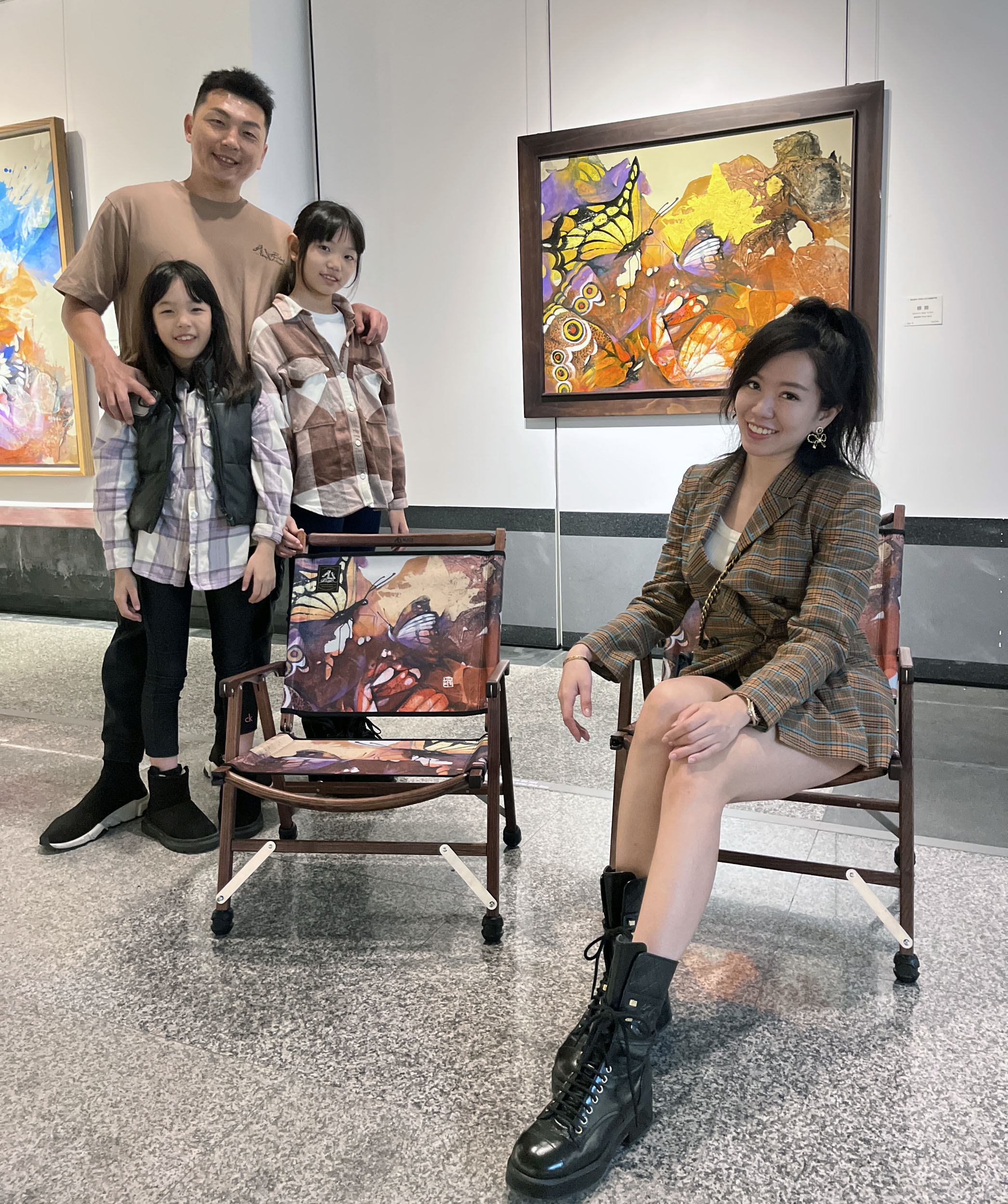 莊明中的作品被開發文創商品椅子,王先生一家特地將椅子拿來展場與原作《蝶舞》合影