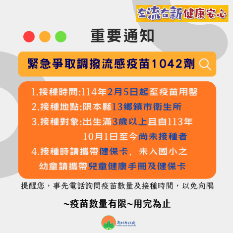 為降低感染後發生重症和死亡風險,衛生局請65歲以上長者、幼兒及慢性病患等高風險族群,儘速完成流感疫苗接種,以及早獲得保護力。另外,衛生局也提醒鄉親先透過衛生局或衛生所網頁查詢接種時間,以確保可施打到疫苗且節省排隊等候時間。
