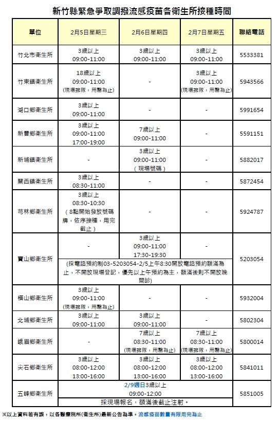 接種疫苗是預防疾病最有效的方式,鑑於近日鄉親關注流感疫苗議題,新竹縣政府衛生局今(4日)緊急向疾管署爭取調撥公費流感疫苗1,042劑(廠牌國光及高端),適用於3歲以上自去年10月起尚未接種者。衛生局表示,因數量有限,依13鄉鎮人口數比例分配至各衛生所,明(5日)起在13鄉鎮市衛生所開診時間開放接種。