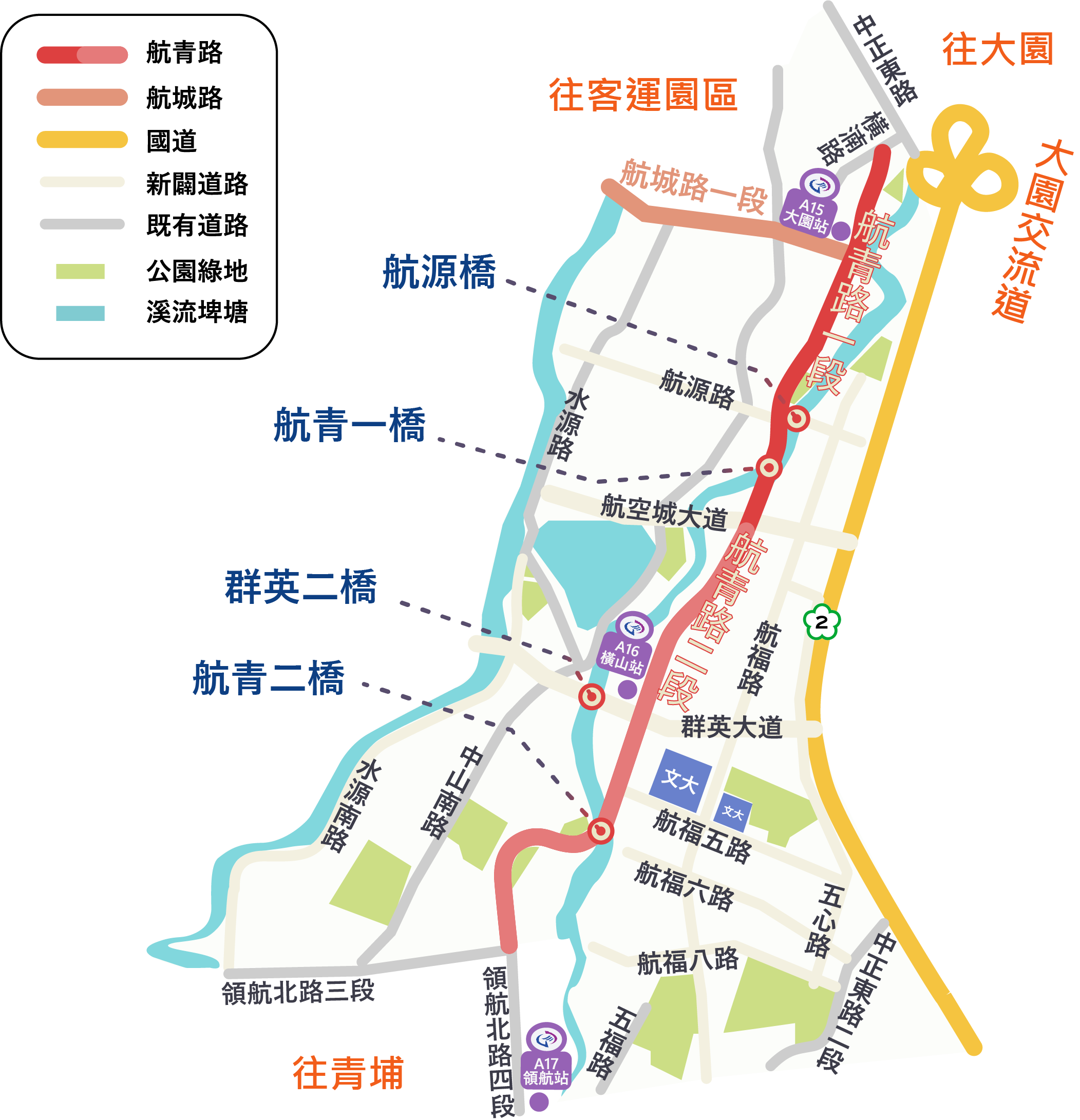 航青路為全新規劃的道路,包含新建航青一橋與航青二橋,全長約4.7公里、路寬50公尺,由北至南鄰接產專區、乙種工業區、商業區及住宅區,同時串聯玫瑰溪畔公園、青峰公園及10處綠地;工程內容除道路主體工程外,並設置有綠植帶、人行道、自行車專用道,且有完善的排水工程、污水管線、共同管道及智能路燈等設施。