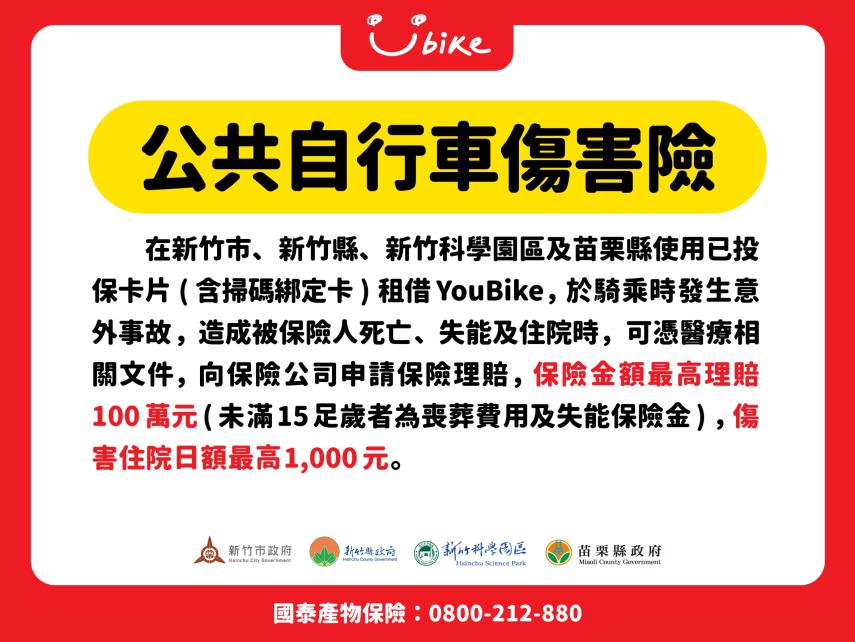 公共自行車傷害險為政府提供之免費保險,保障騎乘者在意外事故中發生死亡、失能或住院時,憑醫療單據等文件向保險公司申請保險理,最高理賠金額100萬元(未滿15歲者為喪葬費用及失能保險金),住院日額最高1,000元。