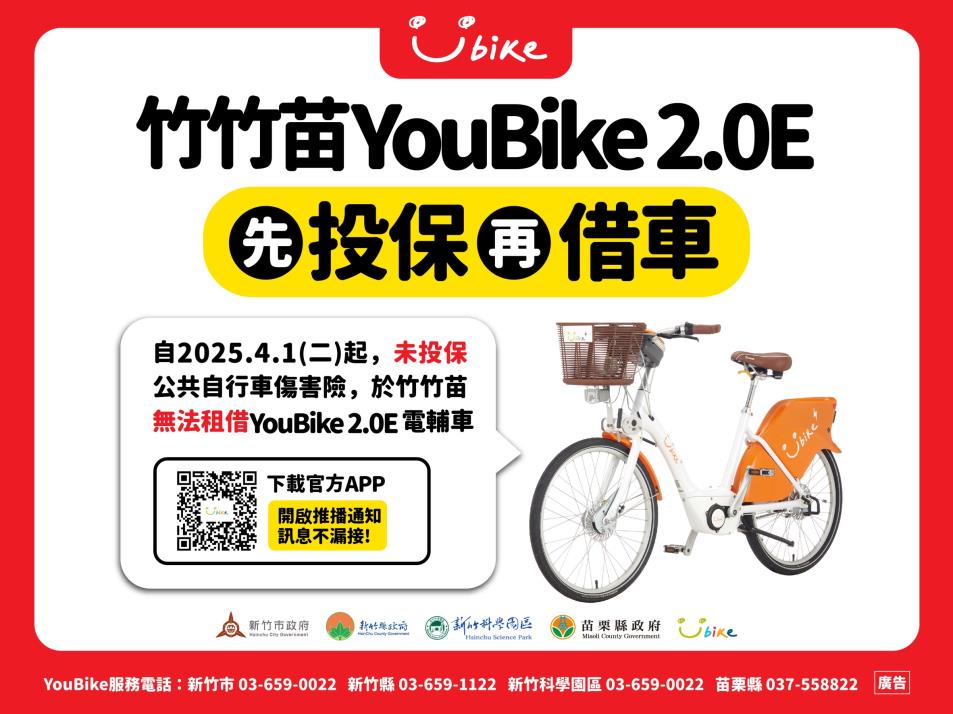 新竹縣近年積極推廣綠色運輸,縣民使用公共自行車頻率逐步提升,為加強保障騎乘安全,新竹縣、新竹市、苗栗縣及新竹科學園區管理局於「園縣市高峰會」會議中,決議對YouBike 2.0E電輔車實施強制投保公共自行車傷害險,114年4月1日起租借YouBike 2.0E電輔車須投保,未投保無法租借,民眾只要上微笑單車官網、APP登入會員後即可加保,費用由縣府負擔,讓鄉親騎乘安全有保障。