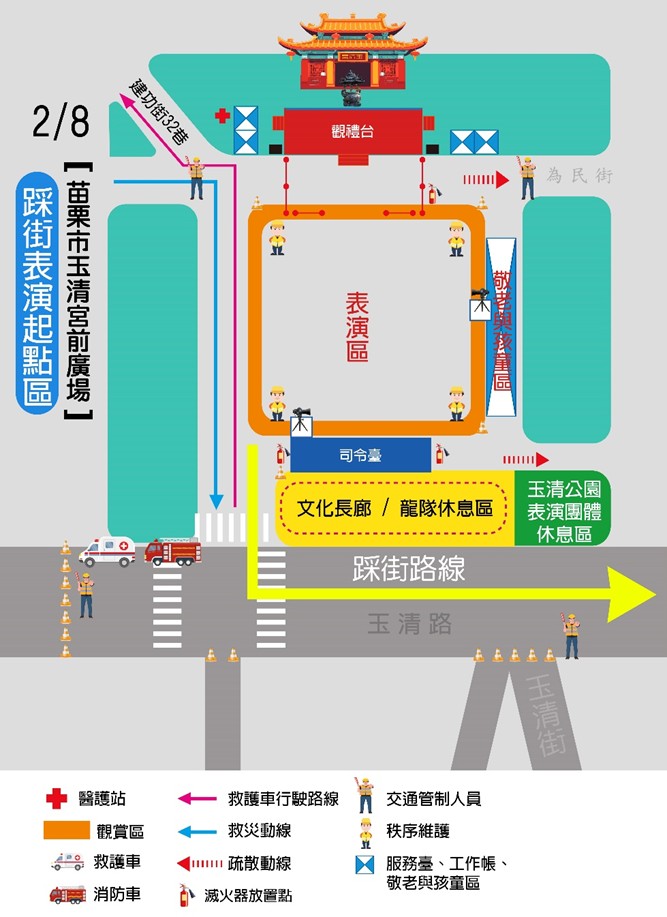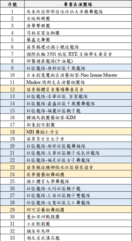 還有國立體育大學舞龍隊和建功國小競技龍隊的LED夜光龍,以及芎林客家金獅團、苗栗紫玄宮太子會和頭屋布馬陣的民俗藝術表演。在地團隊如苗栗縣體育會廣場舞委員會、MH舞蹈工作室、邱可芬藝術舞蹈團和展夢圓藝術舞蹈團和社區龍隊都熱情參與,獲得鄉親最大的鼓勵與喝采。而眾所矚目龍隊的火旁龍秀,分別在下午5點和晚間8點30分兩階段在玉清宮廣場搶先開火旁,想要感受火旁龍震撼的民眾千萬別錯過了。同時在玉清路上和貓裏喵親子公園,從晚上6點時起也安排了苗栗社區團隊的才藝表演。