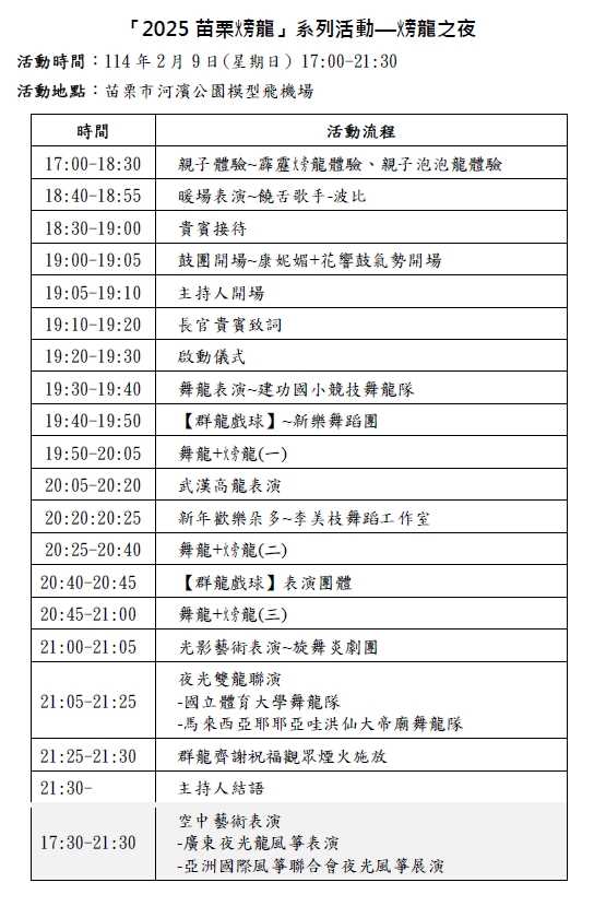 相關活動資訊請網路搜尋「苗栗火旁龍」FB粉專查詢。