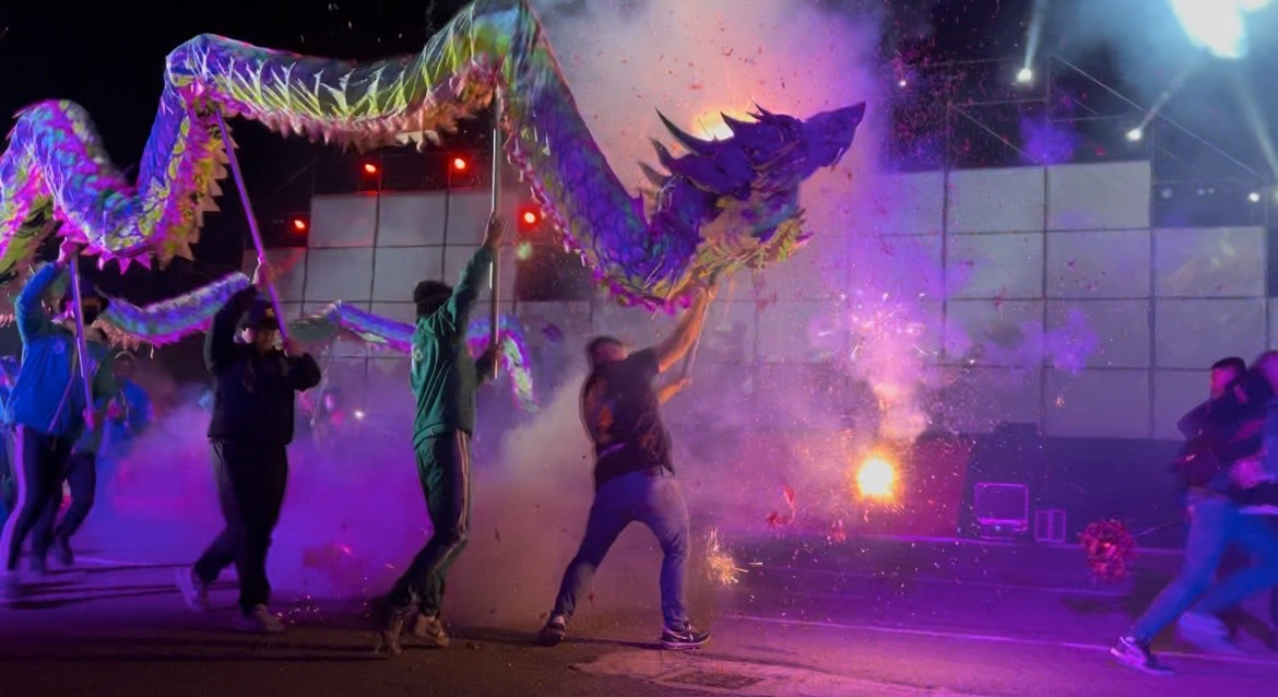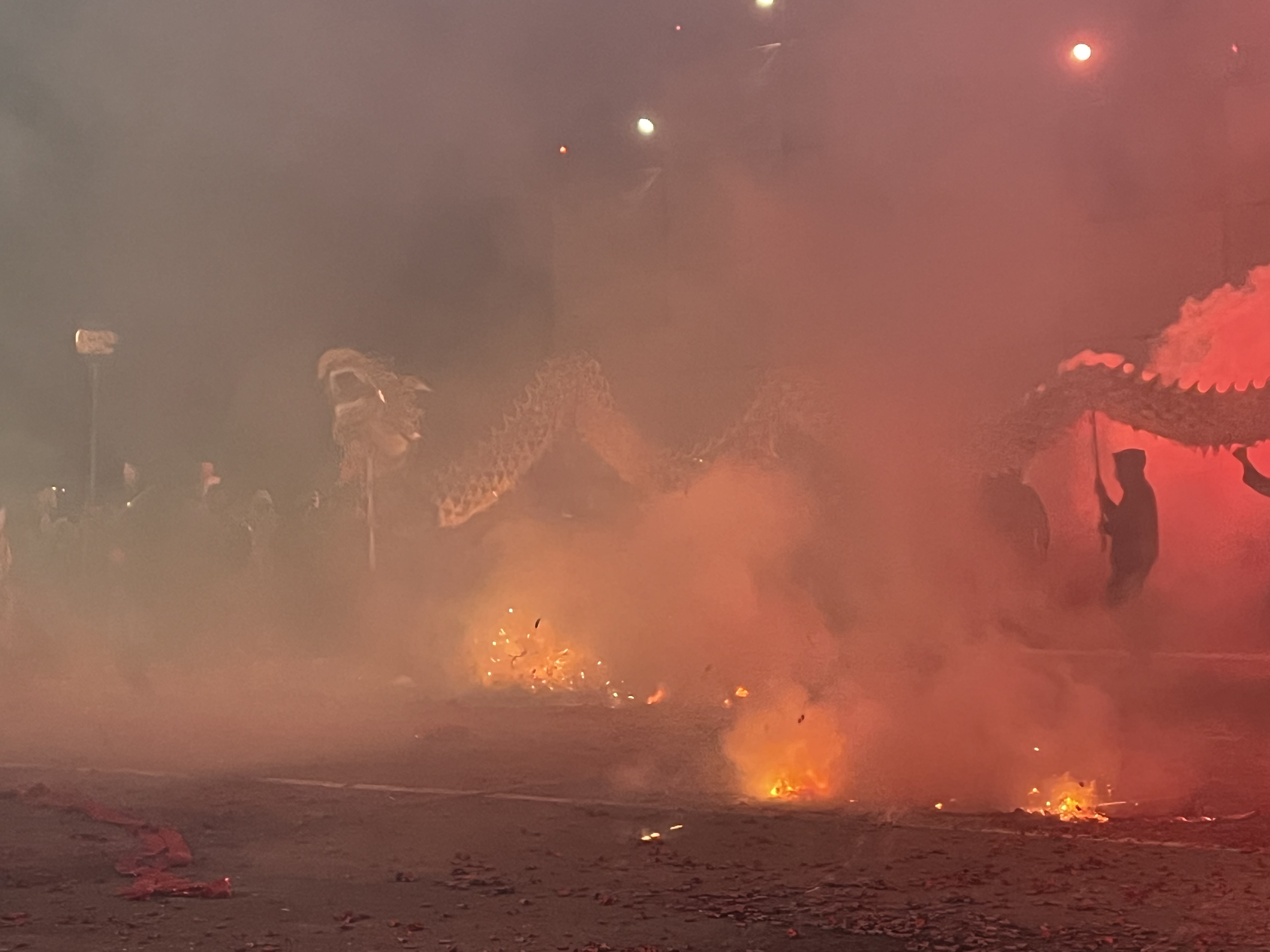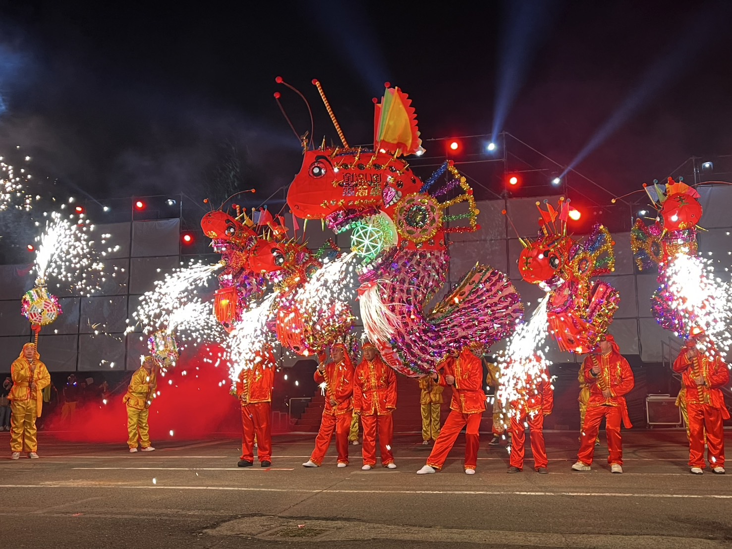 緊接著,活動主秀─七尾祥龍輪番登場,接受炮陣洗禮。在連綿不絕的炮聲中,祥龍穿梭於濃煙之中,賣力起舞,猶如神龍騰雲駕霧,震撼十足,現場驚嘆聲此起彼落。同時,廣東風箏協會的夜光龍風箏也在空中翱翔,展示「龍吐珠」「戲鞭炮」「噴煙花」等精湛技藝,與地面火旁龍表演遙相呼應,共同譜出「天上飛龍、地上火旁龍」的視覺饗宴。