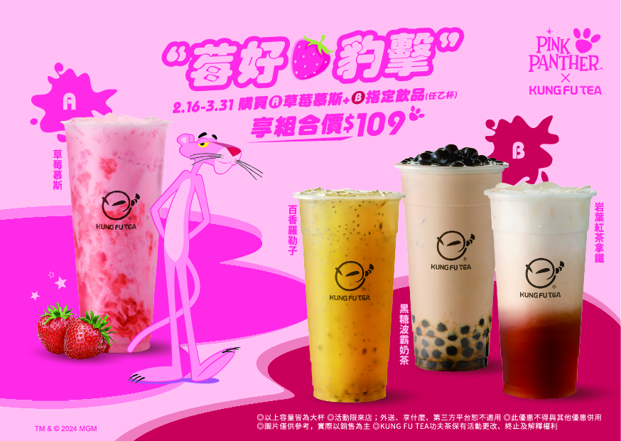 粉紅甜蜜浪潮不斷延燒!02.16起至03.31,凡至全台功夫茶門市,購買「草莓慕斯」搭配指定飲品「百香羅勒子」、「黑糖波霸奶茶」、「岩葉紅茶拿鐵」三擇一,即可享有$109超值組合價!這波粉紅魅力不僅帶來夢幻甜蜜的飲品體驗,更讓粉絲感受頑皮豹的俏皮靈動。趁著期間限定優惠,快到功夫茶門市,把握這場粉色狂潮,與摯愛、好友、家人還有自己,共享專屬於這個季節的「莓」好時光。