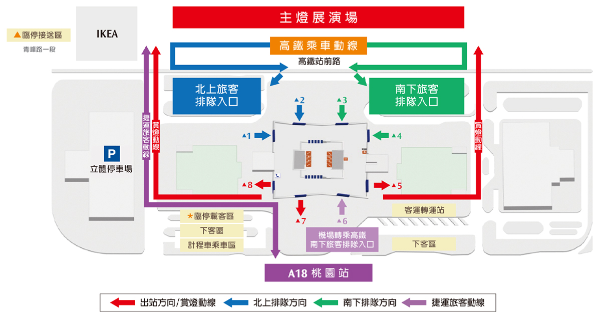 ž 臨停載客區:交通管制期間,請旅客多加利用青峰路一段備有臨停接送區。原車站8號出口之臨停接送區將實施「人等車」交通管制,禁止車輛於該區停等候客。